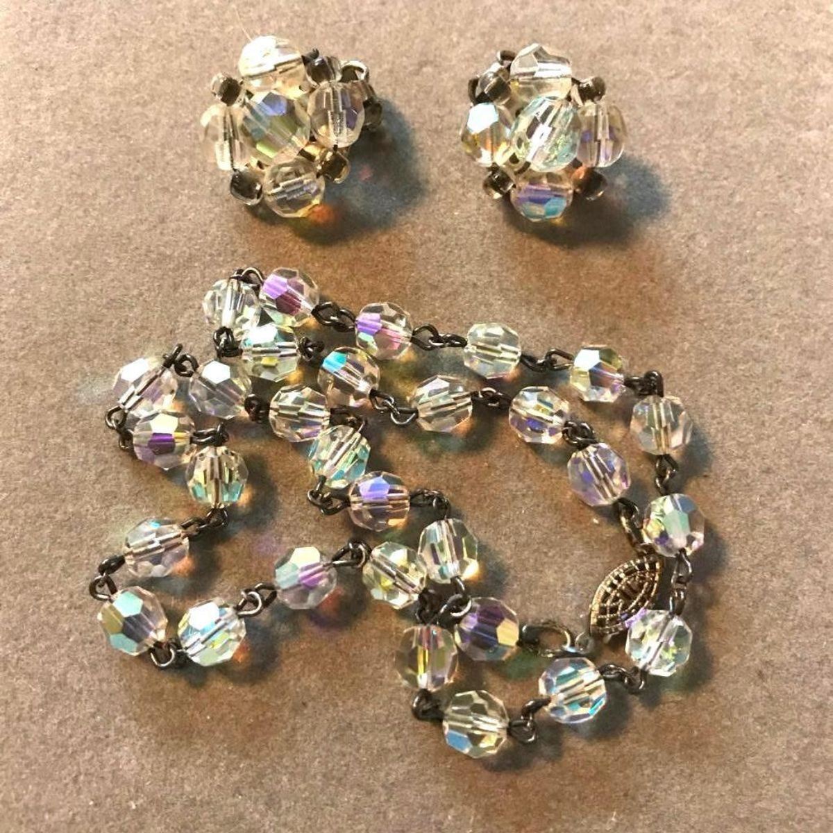 Vintage mid century 1950's aurora borealis crystals cluster clip-on earrings & matching 16" aurora borealis crystal & silver necklace.