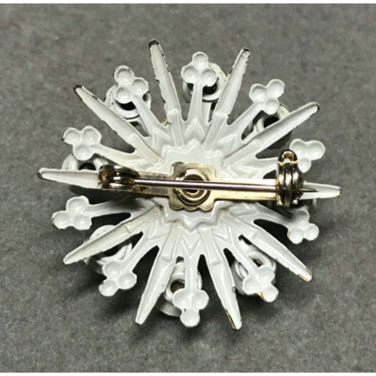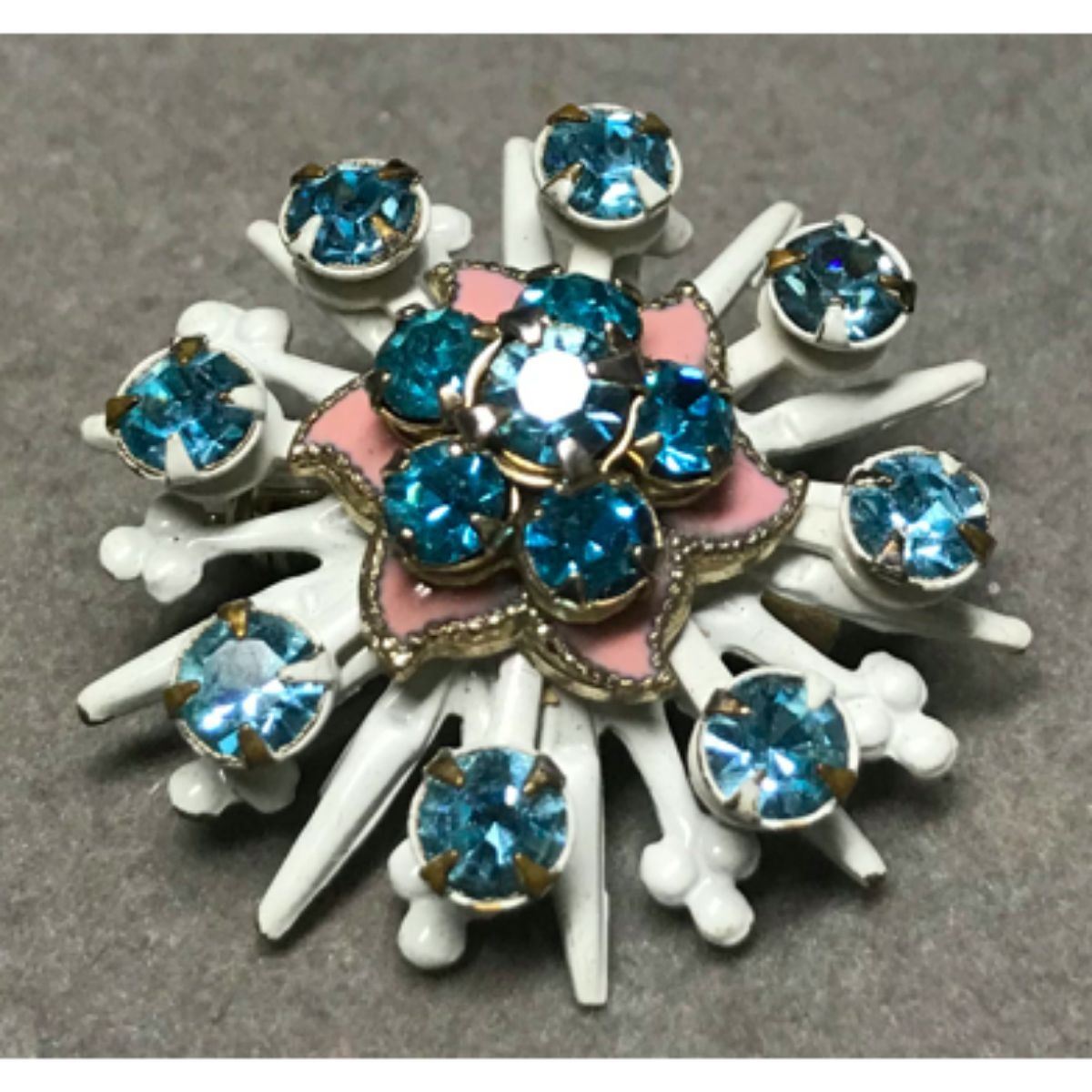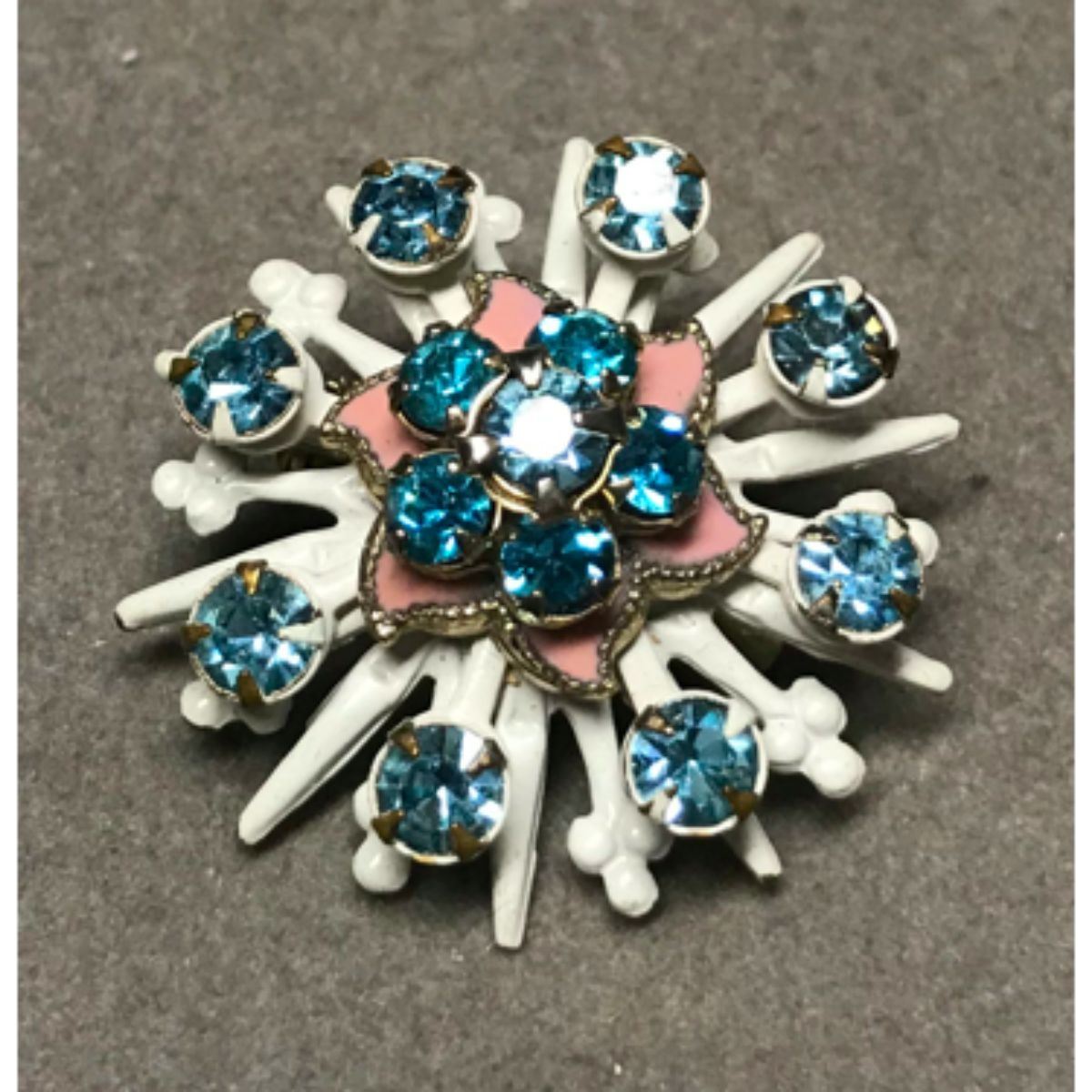 Vintage, mid century white & pink enamel over silver tone starburst form brooch pin with light blue crystals. 1 1/4" D.