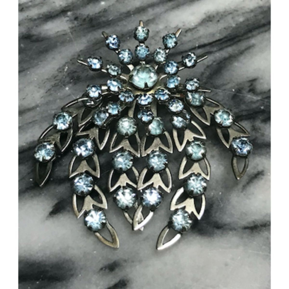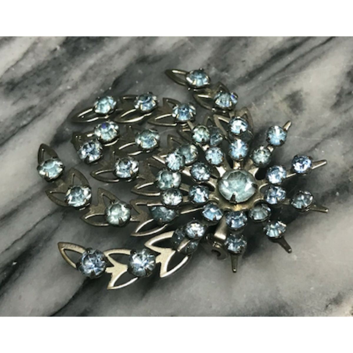 Vintage mid-century light blue rhinestone & white metal starburst brooch. 2". - 10668-052918-EB-64600