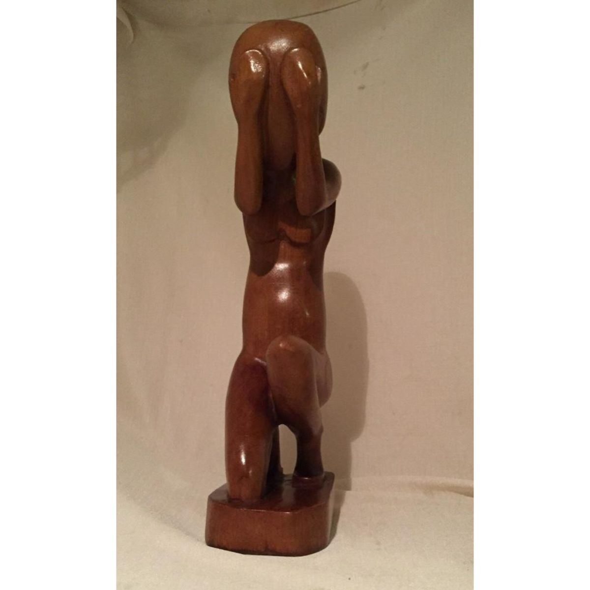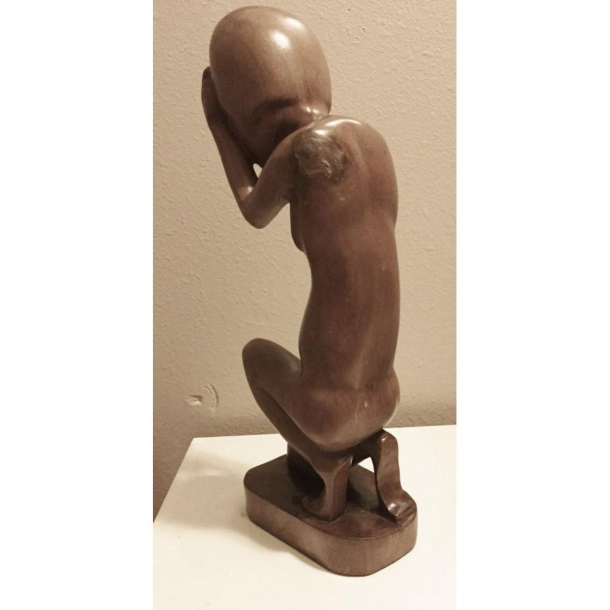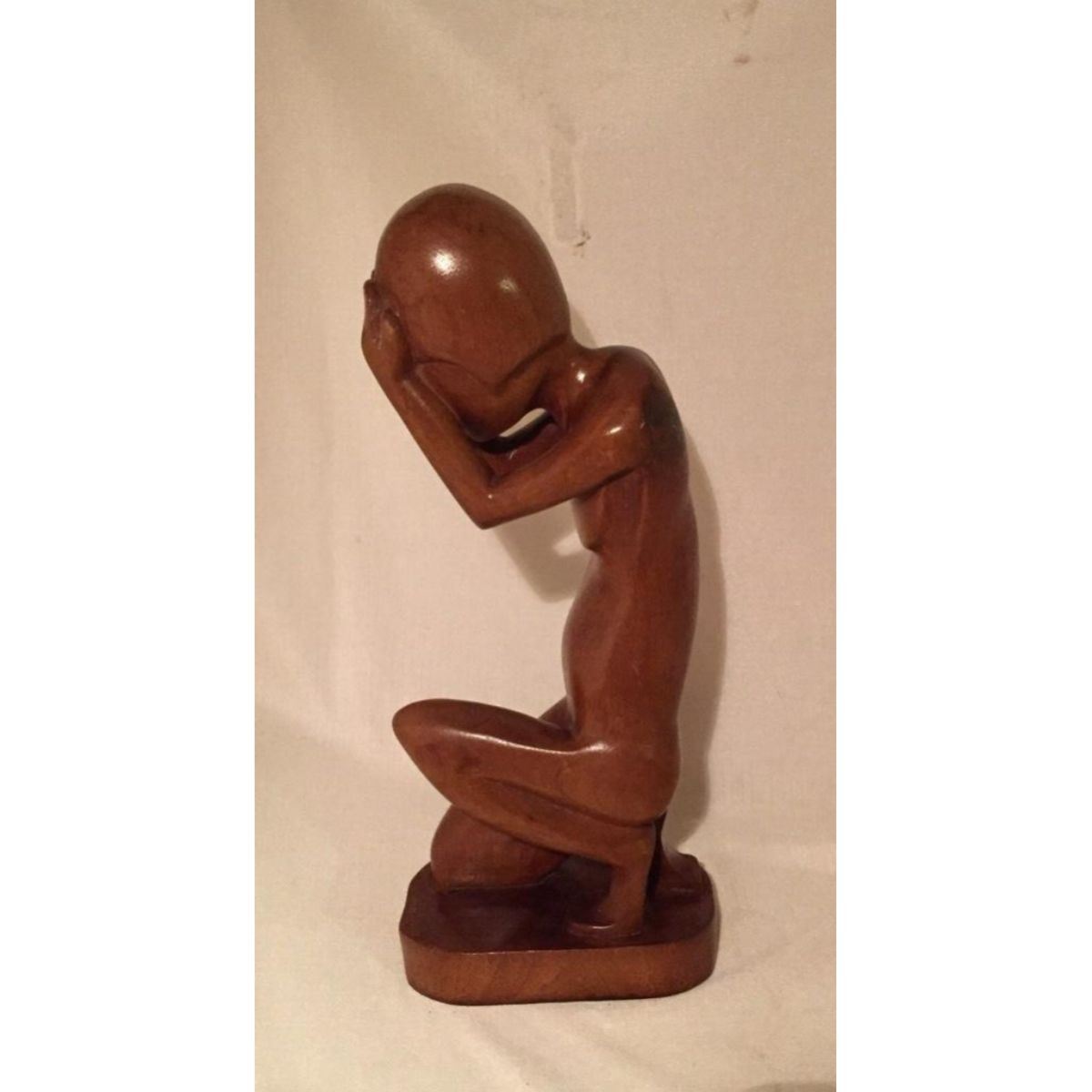 Vintage, Mid-Century Modern wood carving - Despair, depicts a nude female figure kneeling with head in hands. 16".Â