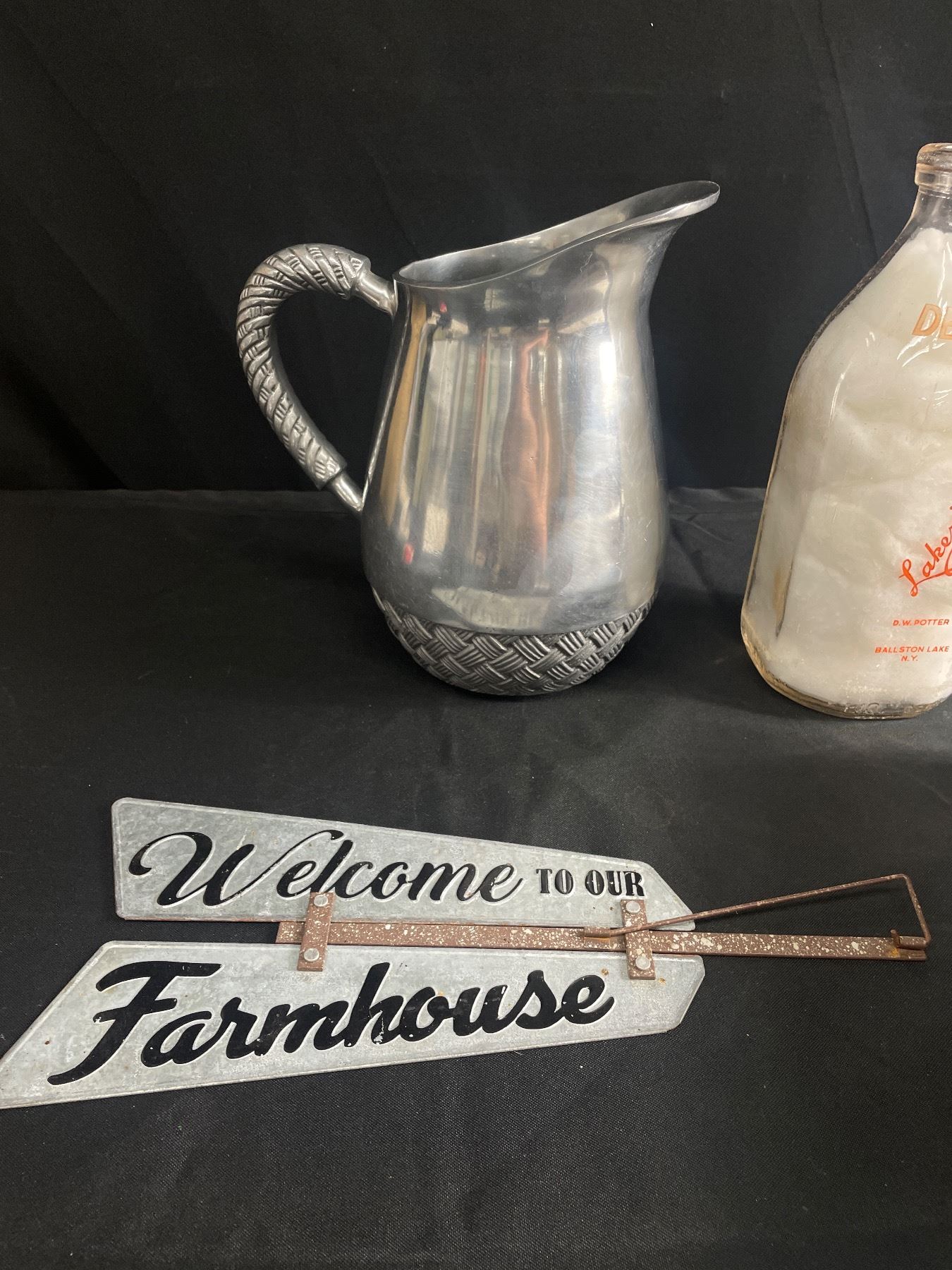 Vintage Milk Bottle, Beatiful Metal Pitcher, Storage Box and Farmhouse Sign