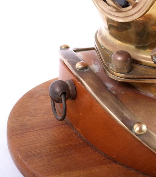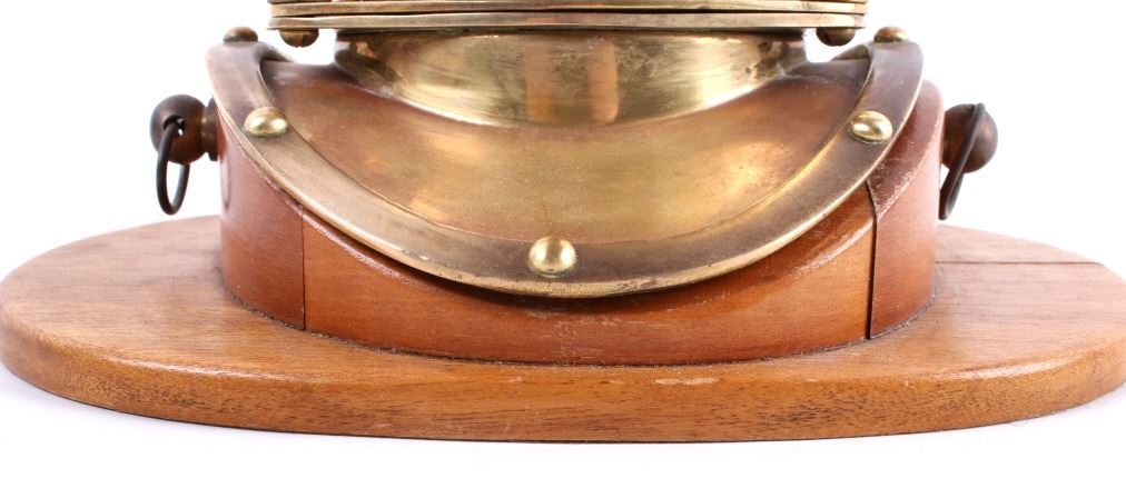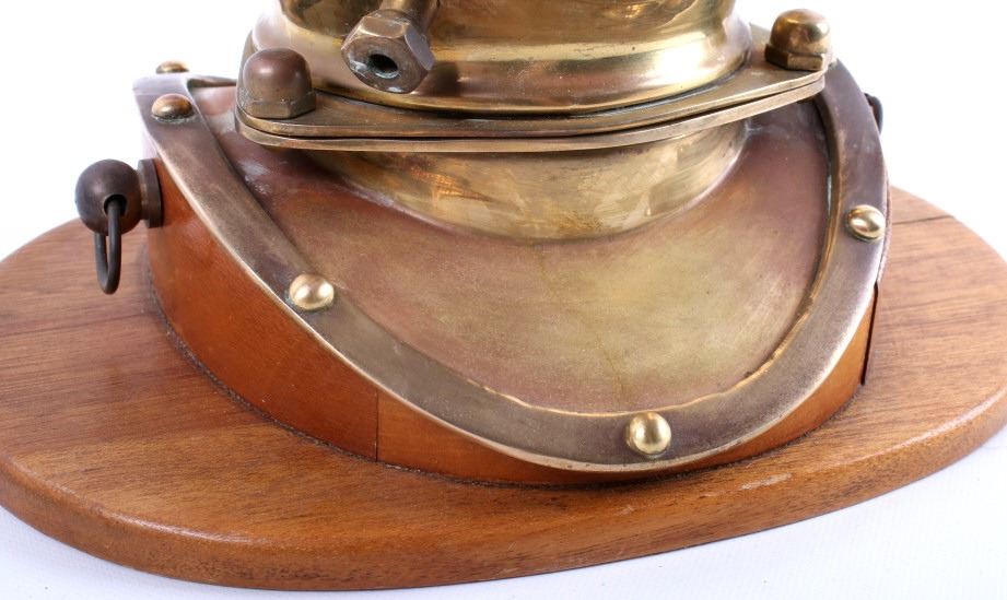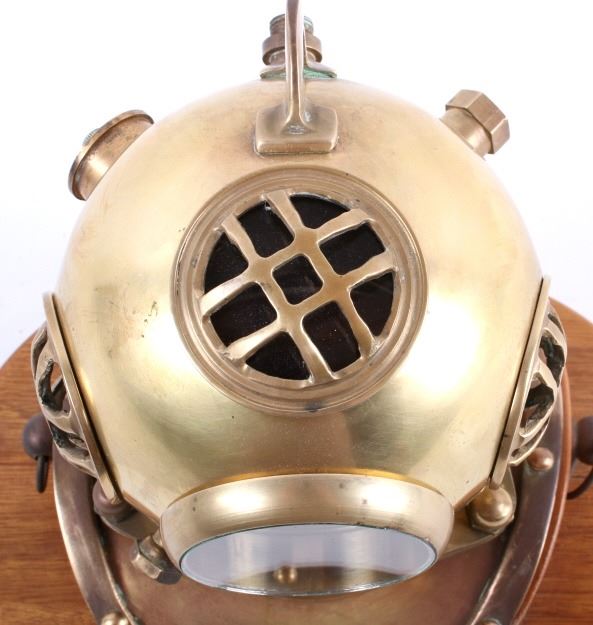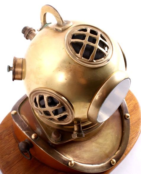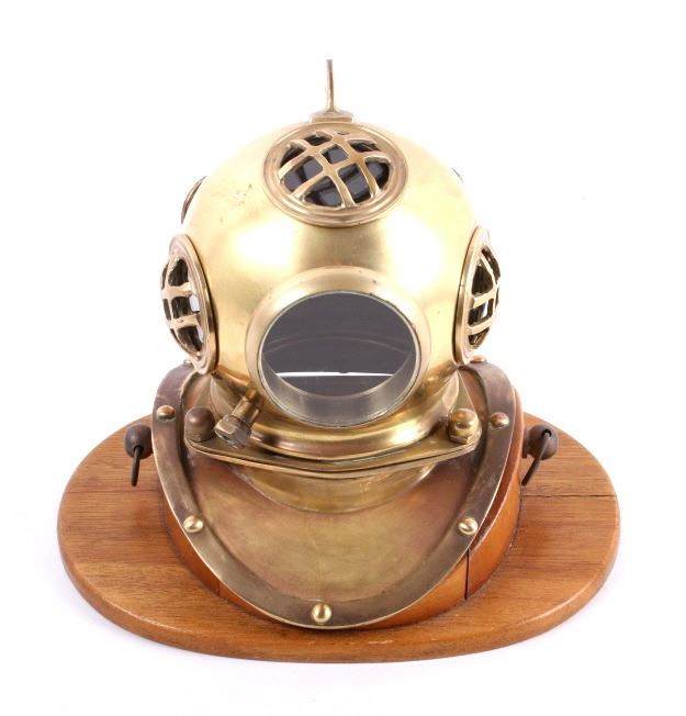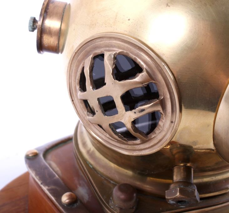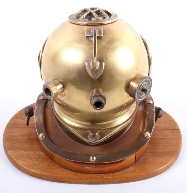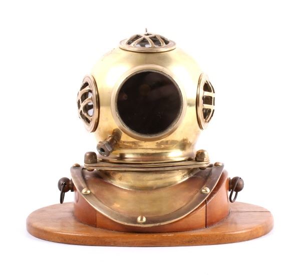 Featured in this lot is a vintage bronze replica diving helmet. It is a miniature size with all the parts and accessories built to proportion. The helmet shows the face plate, breast plate, studs, regulating escape, and other parts common to antique diving helmets. This helmet comes with a wooden stand and measures 8" tall, 6.5" deep, and 9" wide with stand. The helmet is in good condition.