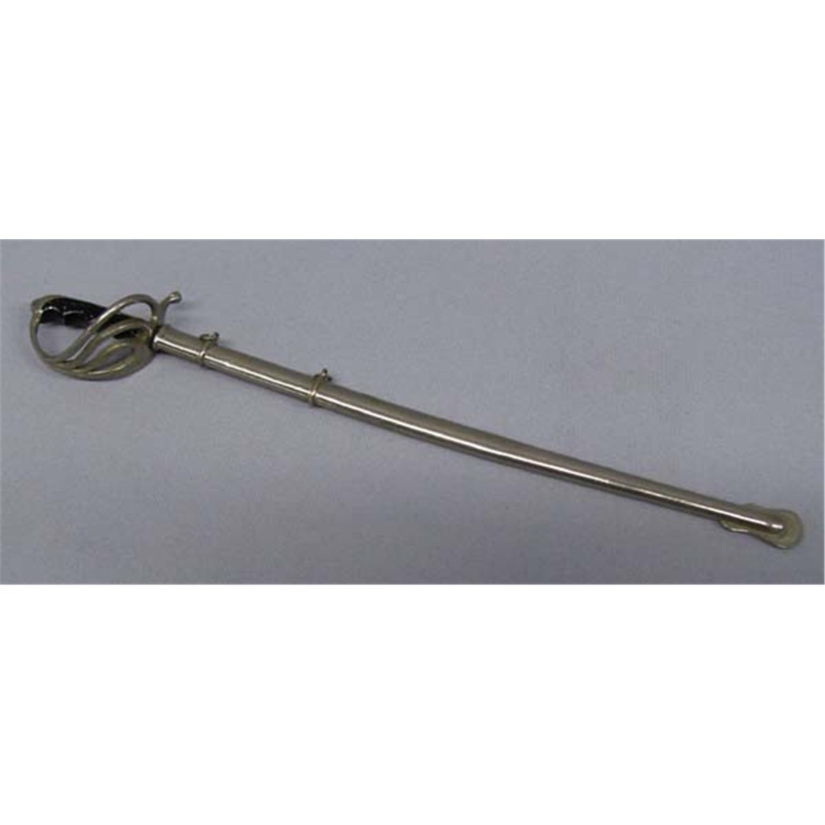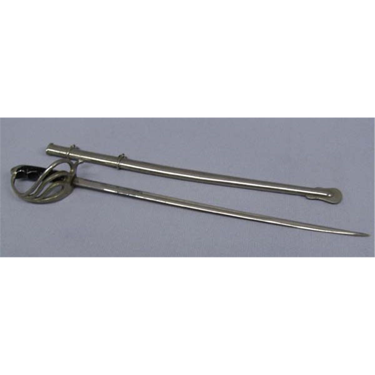 Vintage Miniature Sword. Sword with scabbard measures 9.5'' in length and widest point is 1.5''. Not marked. Buyers Pay Actual Shipping and Handling Charges(see terms and conditions for more information).