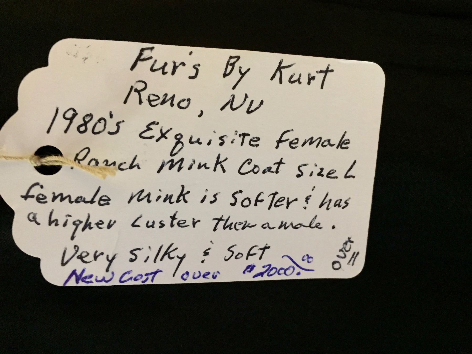 Description: Tag says it is a 1980s, female, ranch mink coat. Female mink is softer and has a higher luster than the male. Maker: Tag says, Furs by Kurt, Reno, Nevada. Approx. Age: Circa 1980s. Size: Approx. ladies large. Condition: Good for its age, normal wear expected. There is a hole in the seam near the right sleeve of the jacket. Please look closely at the pictures - they are an important part of our description. Shipping: There will be a $8 handling / packaging fee for shipping this lot. The actual cost of postage will be added on top of that.