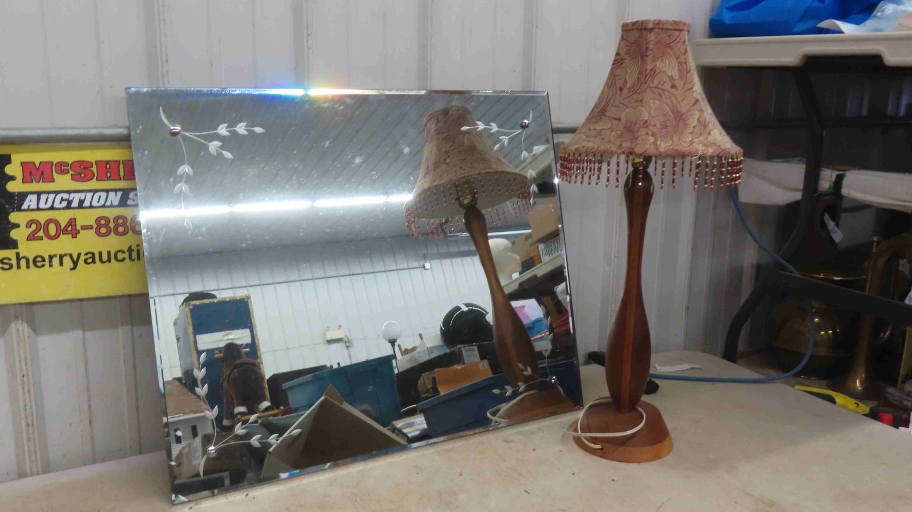Vintage Mirror 30'' x 24'' , Table Lamp with Wood Base and Fabric Shade 27'' T