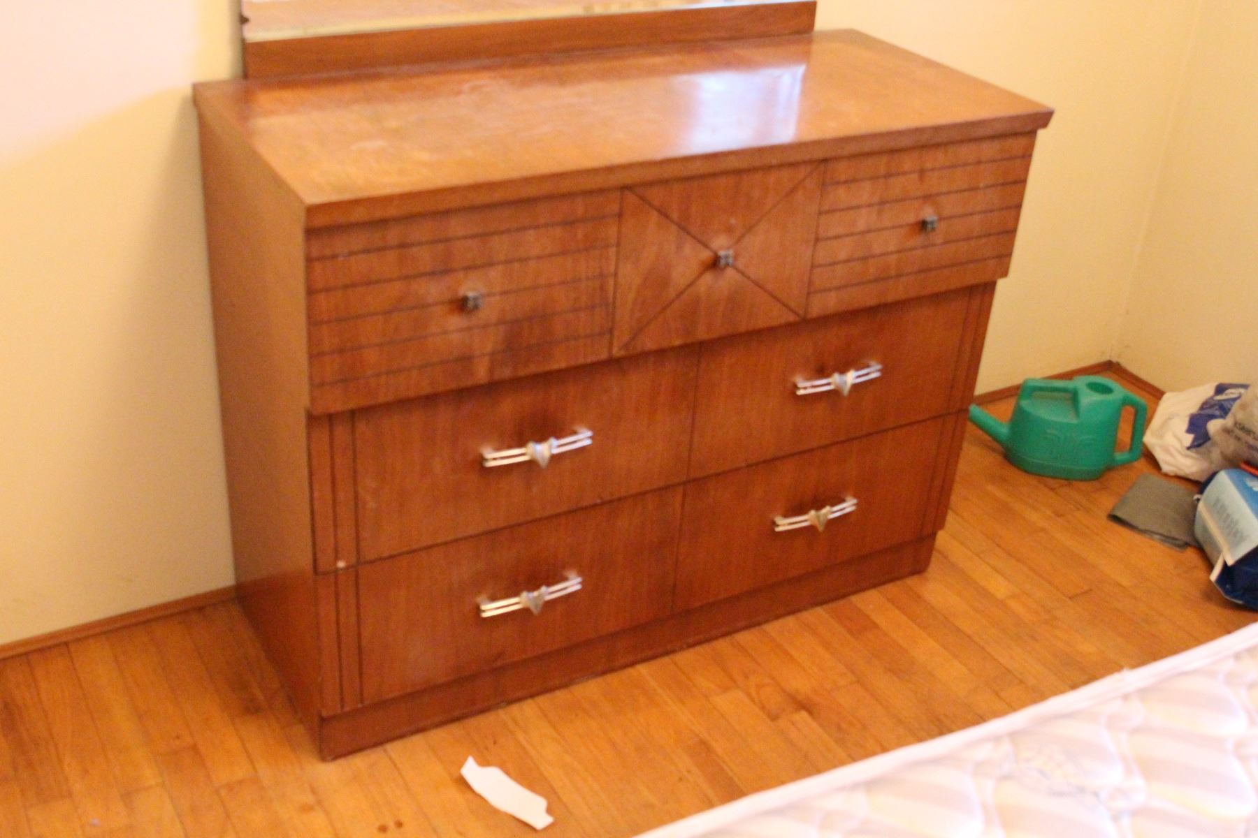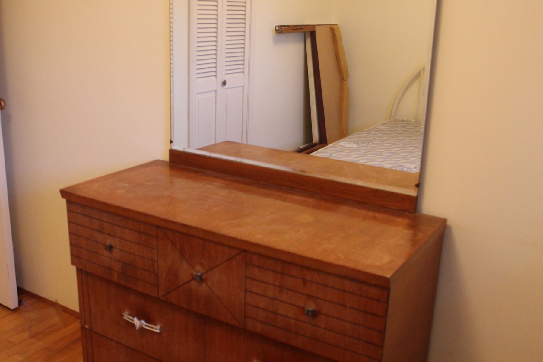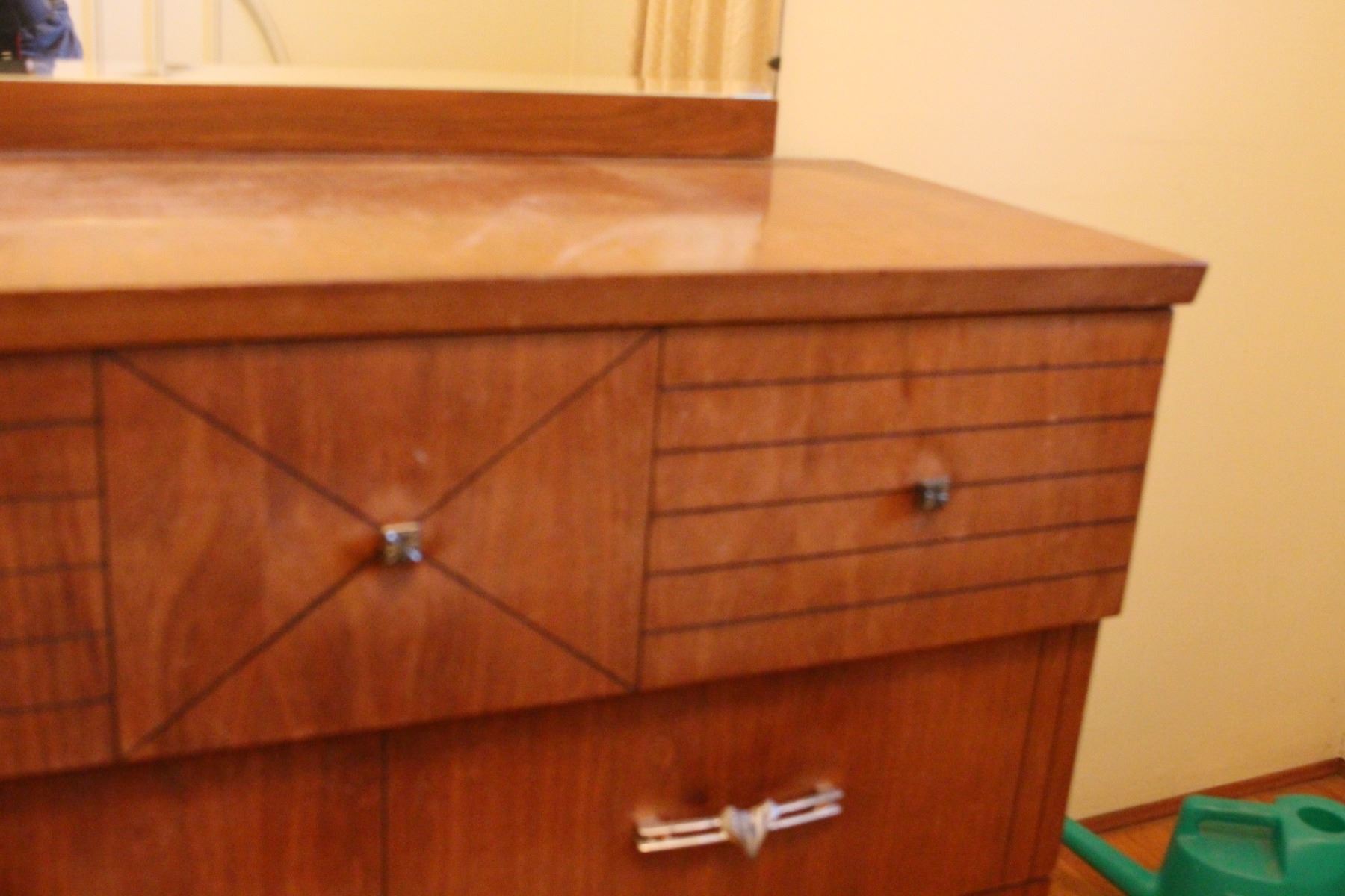 Vintage 3 drawer mirrored dressing table 42X18X62 Contents not included, please note scratches and chips. Bring tools to dismantle mirror and help to remove from home. Pick up 11:00 am - 12:00 pm