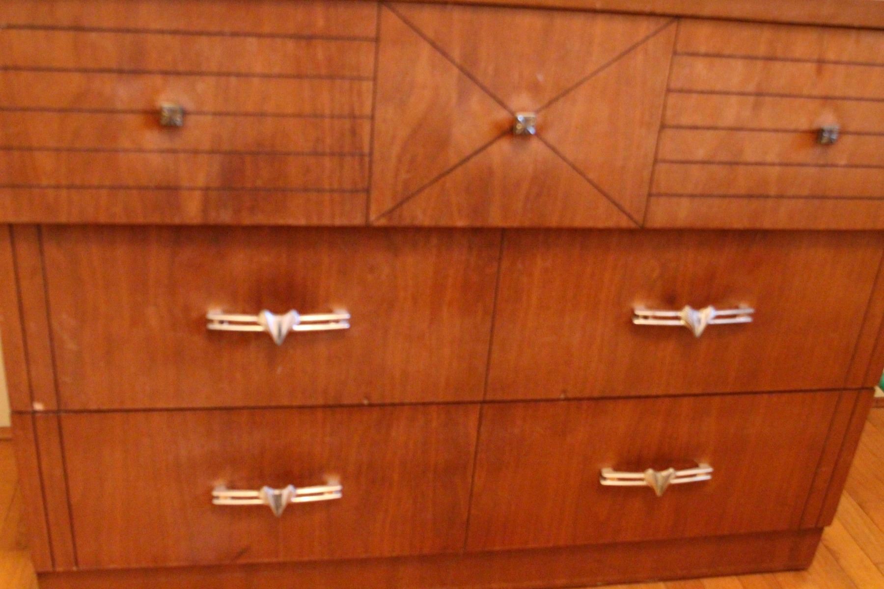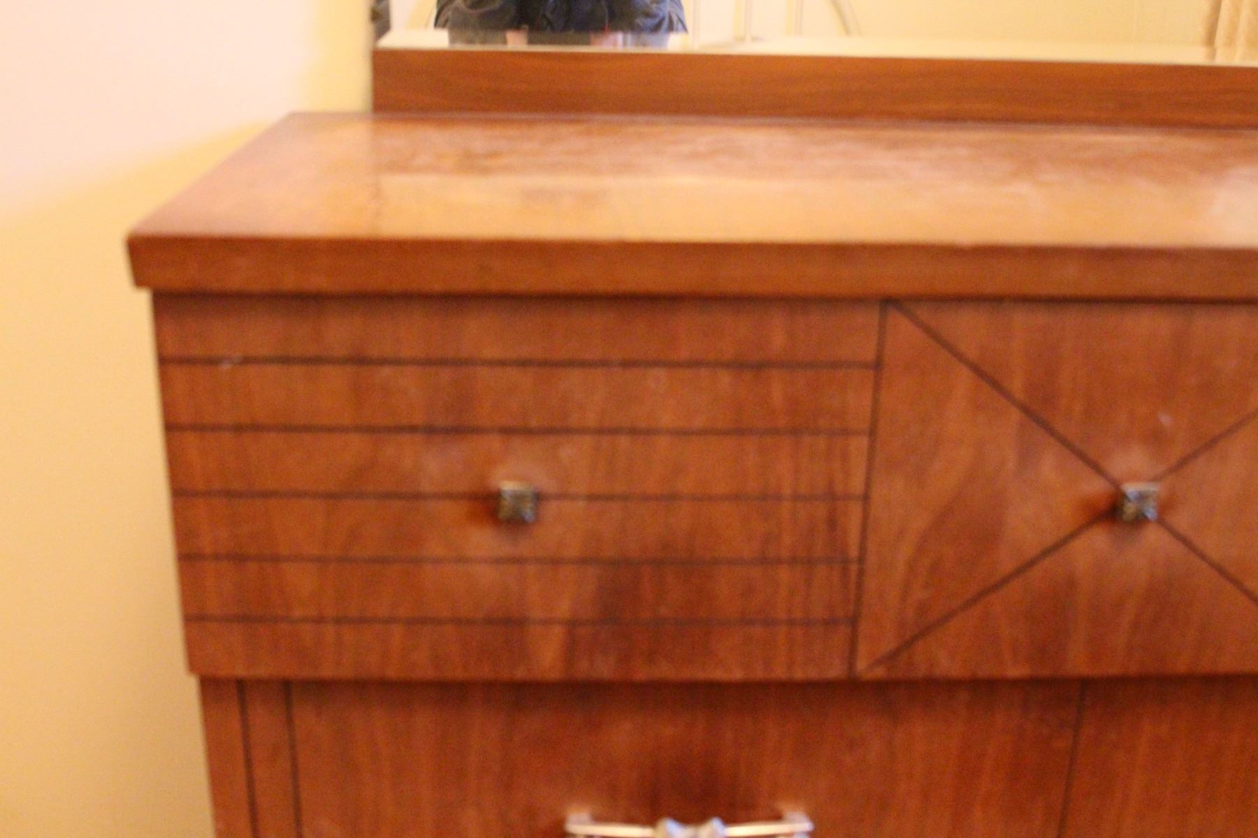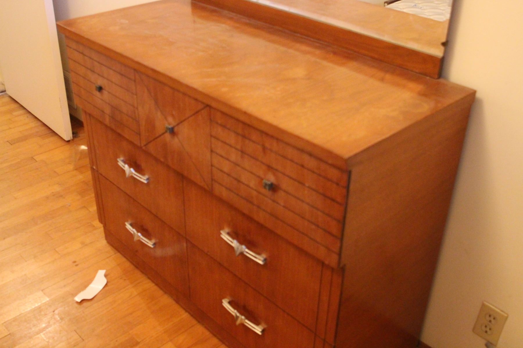 Vintage 3 drawer mirrored dressing table 42X18X62 Contents not included, please note scratches and chips. Bring tools to dismantle mirror and help to remove from home. Pick up 11:00 am - 12:00 pm