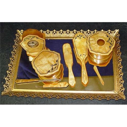 <tr><td>Title:Vintage Mirror Tray Celluloid Vanity Set Clock</td></tr>
