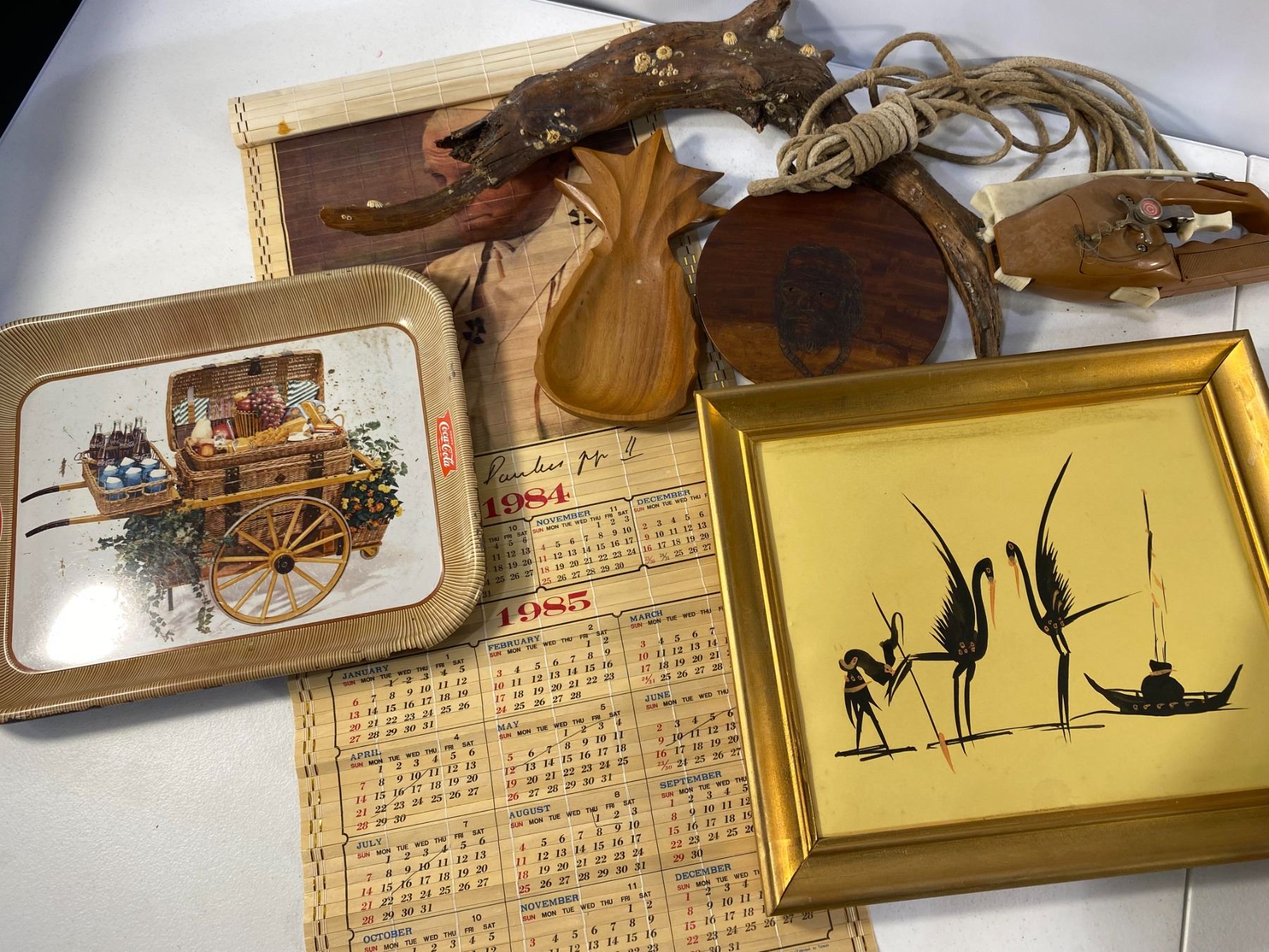 Grouping of assorted vintage decor including framed art, serving tray, driftwood piece, and 1984 85 calendar. Approx. 1970s 1980s. Condition: age wear.