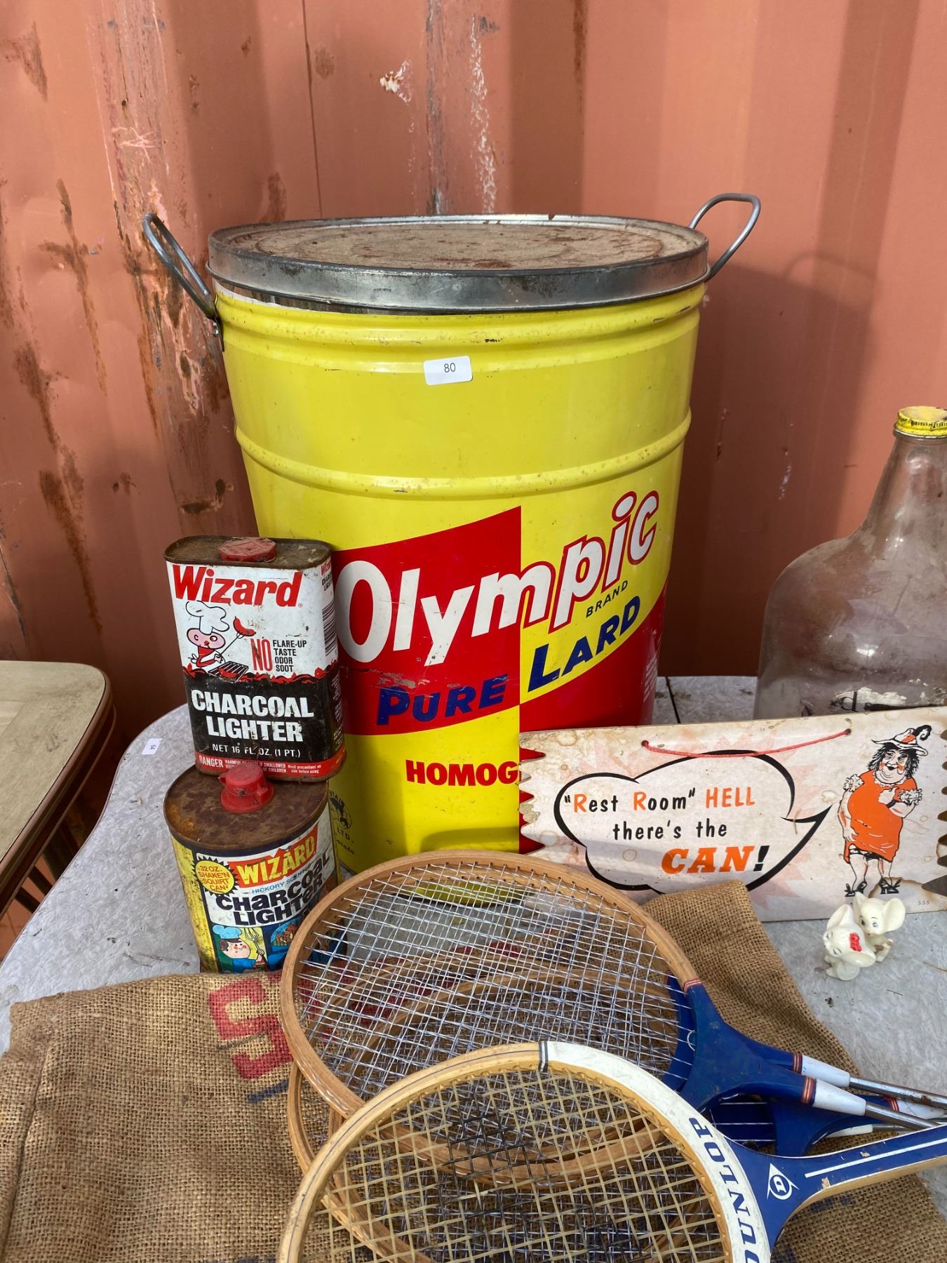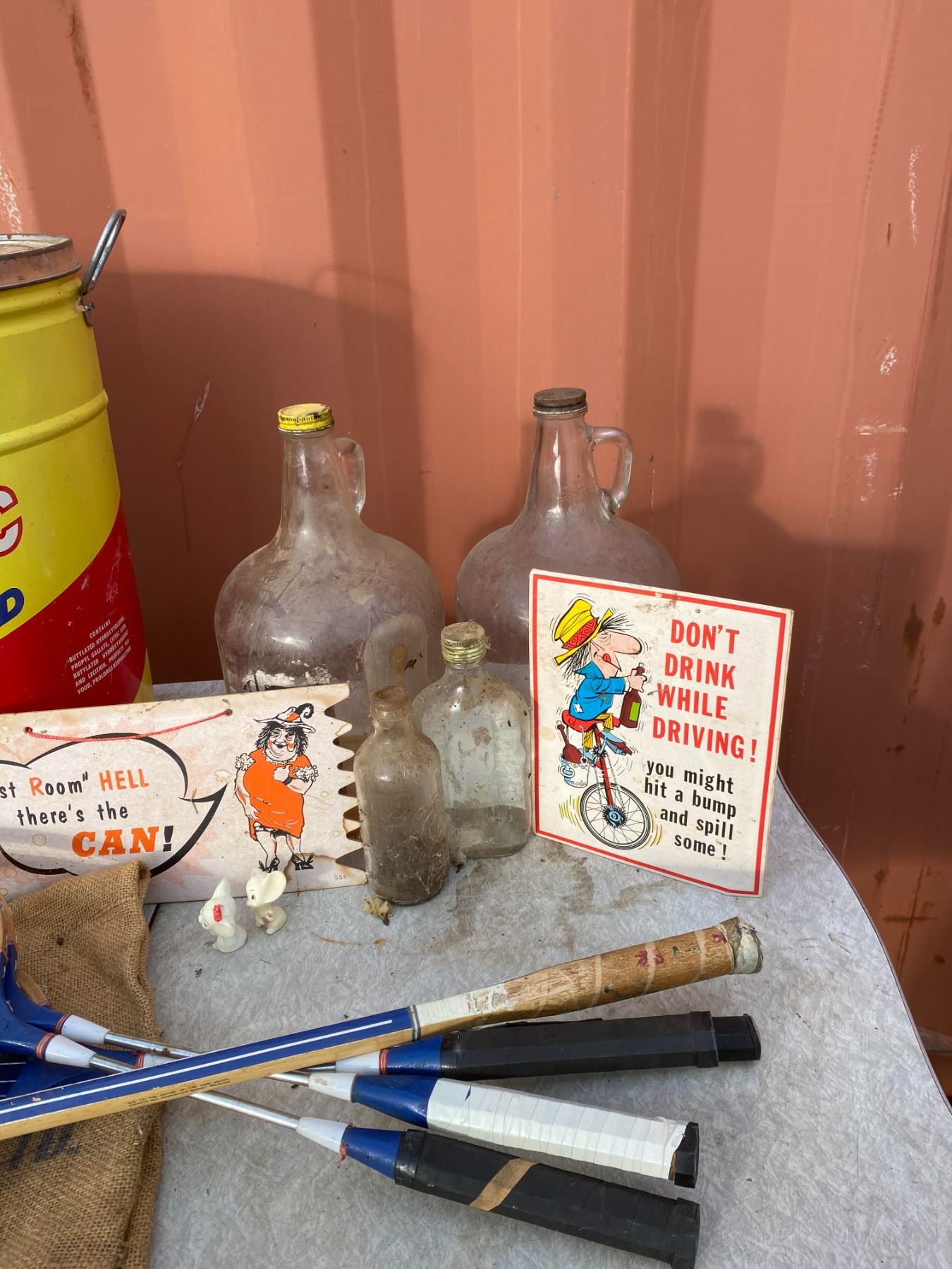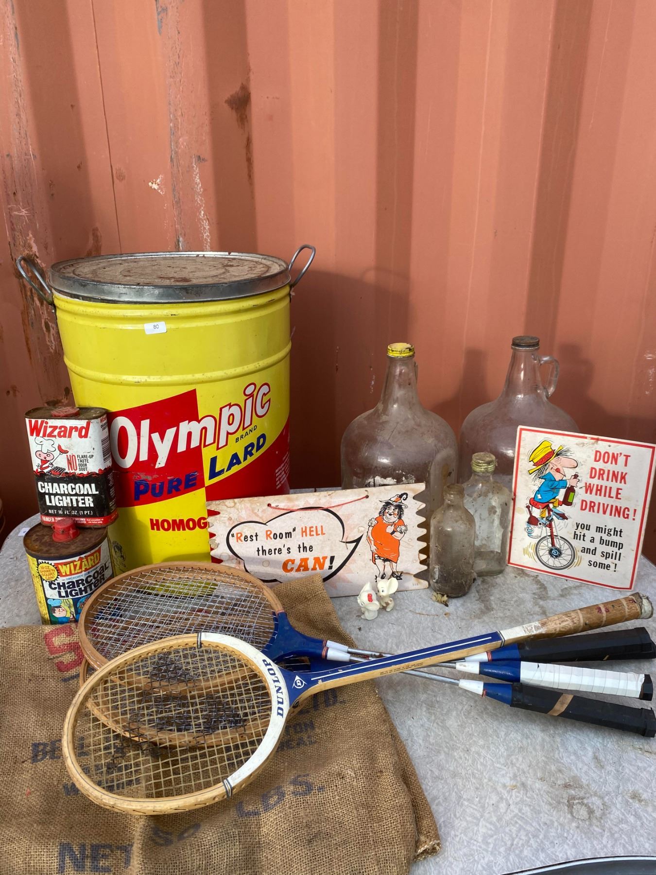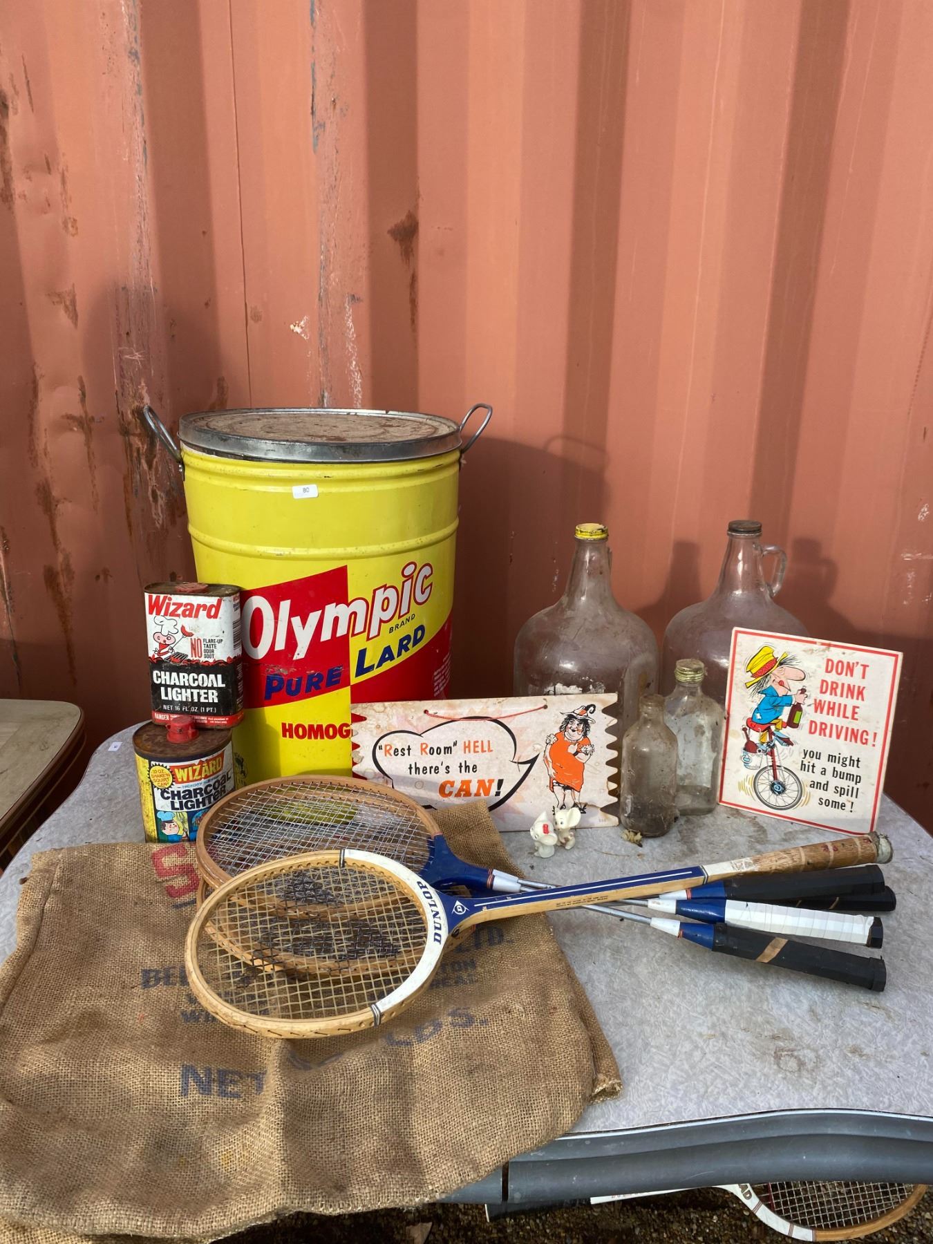 Fun mixed vintage lot including Olympic lard tin, old bottles, badminton rackets, humorous signs, burlap sacks, and small collectibles.