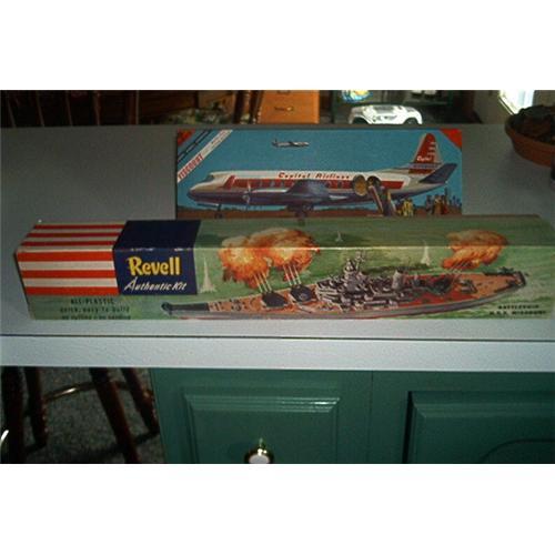 Featuring two separate model kits. The 1st one was made by REVELL; Called the U.S.S. Missouri Battle ship. Kit No. H301;198; REVELL, Inc., Venice, California. C. 1953. All plastic, quick, easy-to-build-no cutting-no sanding. Still contains stickers also. Excellent Condition. The second model was made by VISCOUNT. VISCOUNT TURBO PROP AIR LINER. NO. 503. Capital Airlines Plane. HAWK Model Company, Chicago, Ill. #503; 1/8 scale. (Some small pieces missing from this one). It is also a wall mounting. Two models to enjoy putting together.