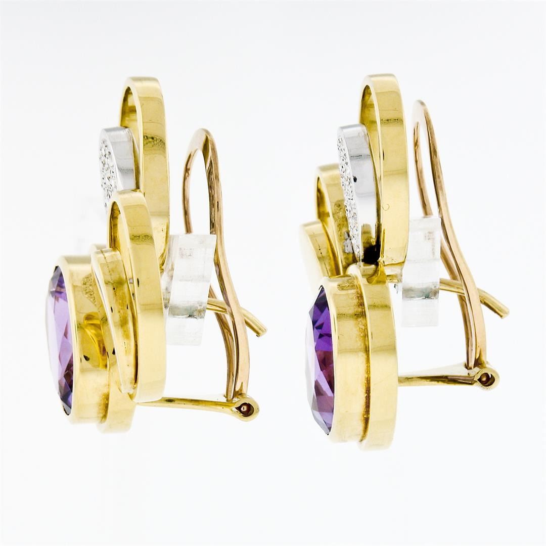A vintage solid 18k yellow and white gold statement earrings, with 2 oval brilliant cut natural amethysts (14x11mm - 13ctw ), and 28 round brilliant cut natural diamonds (G/H - VS1/VS2 ; 0.40ctw). The earrings measure approximately 30.6x26.55mm and weigh a total of 23.86 grams.