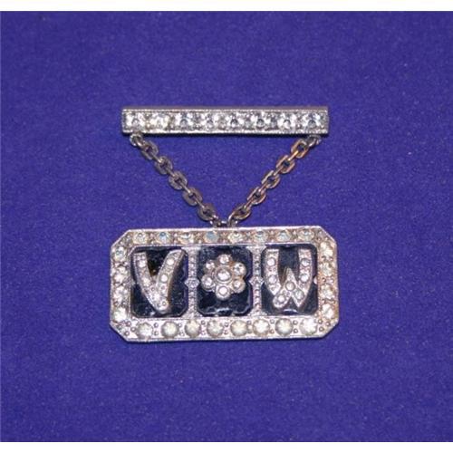 Suspended from a Paste Rhinestone Bar Pin is a superb vintage Monogram Brooch from the Estate of Vivian Weber. This Art Deco Era 1930s Brooch consists of 3 plaques of Onyx prong set in a white metal Pava set White Paste Rhinestone frame. Riveted to each one of the Onyx plaques is a Rhinestone set initial V then a Flower and the initial W. All Findings are original, closing with the old C style pin stem and measuring 2 inches long and 1 inch wide.