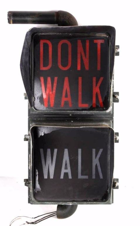 This is a vintage LFE Corp. Automatic Traffic Walk Signal light. The light has been wired and does work. This piece has a wonderful vintage age and shows the glass lens "Walk" and "Don't Walk". The light is wired and lights up displays excellent. Measures 34"x15.75"x18.5"