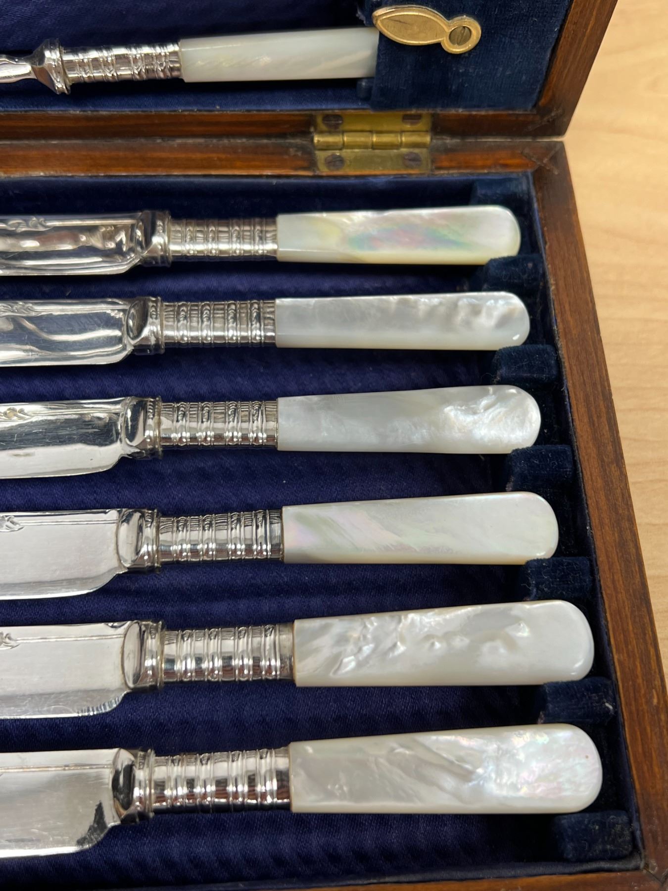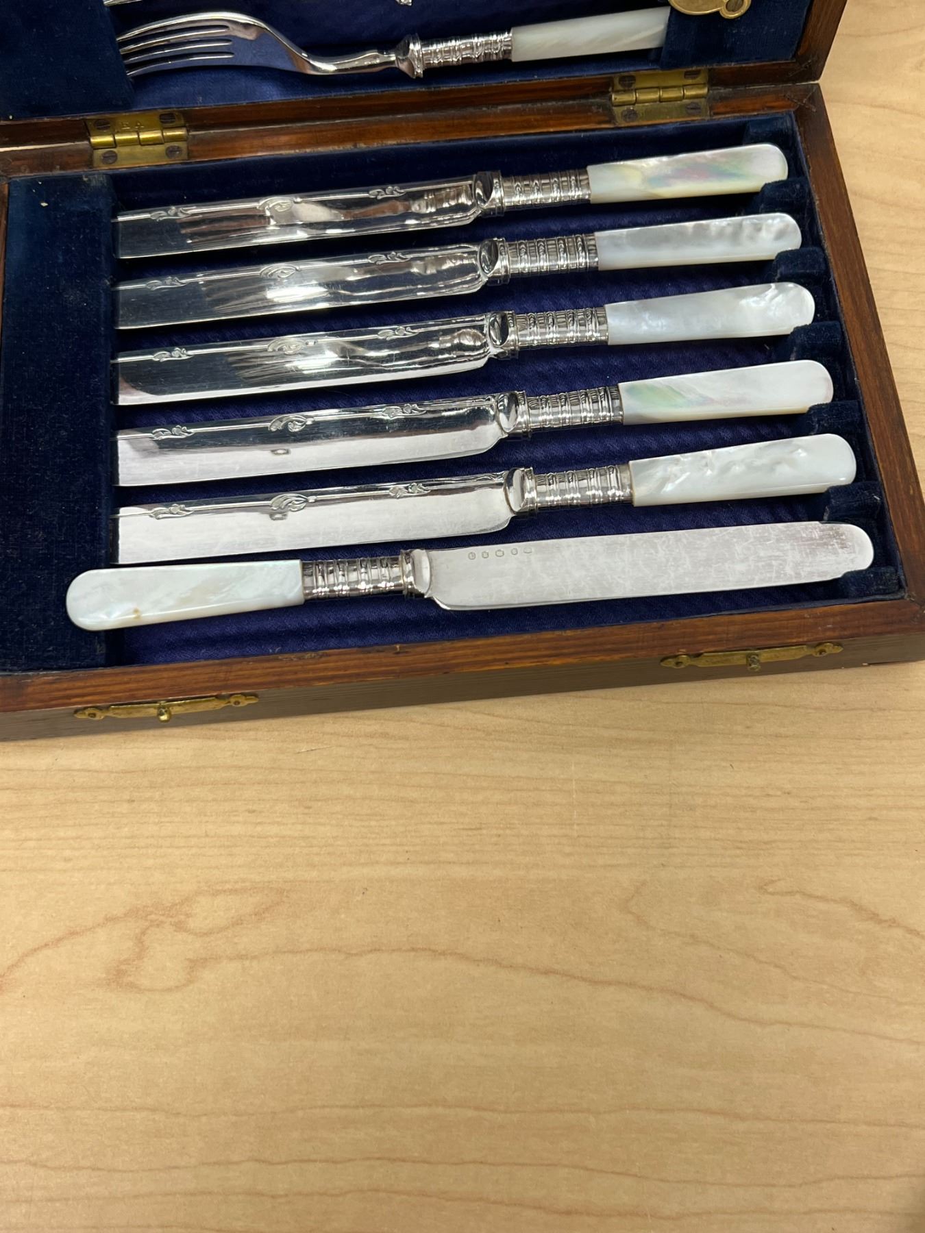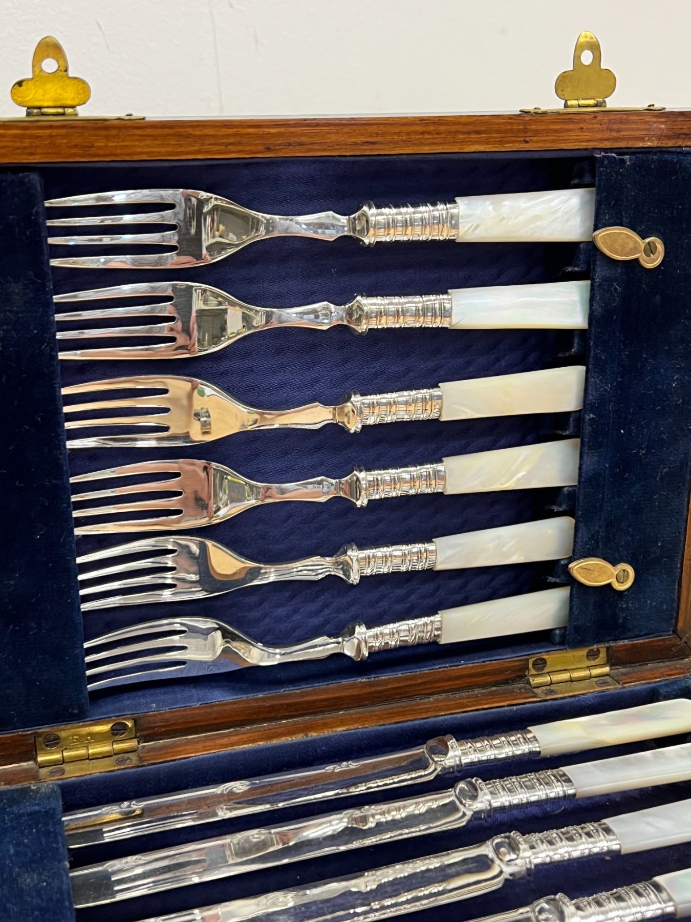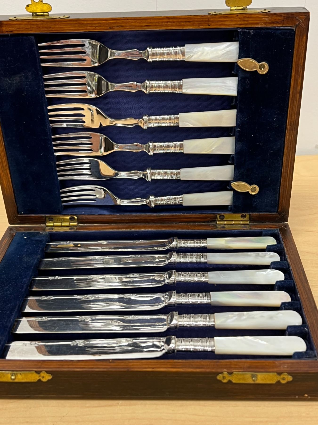 Vintage Mother of Pearl 12 Piece Cutlery Set in box - Knives 7.5" Forks 6"; see photos for markings