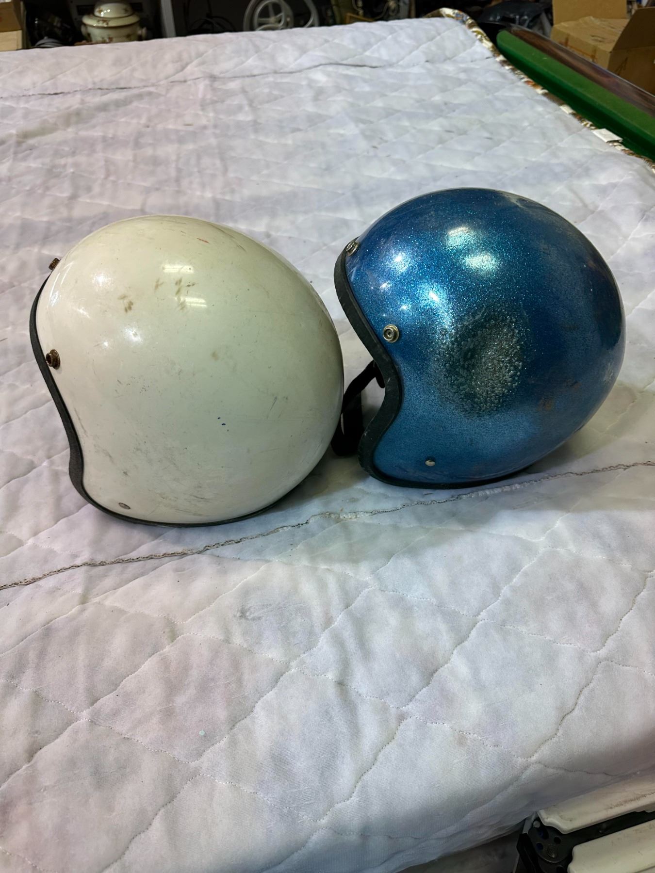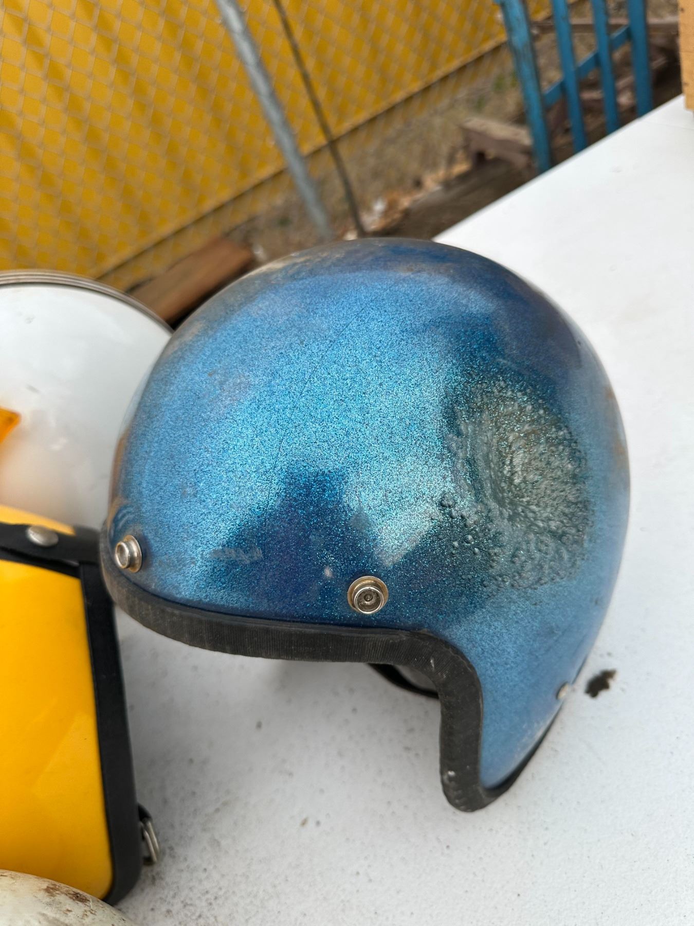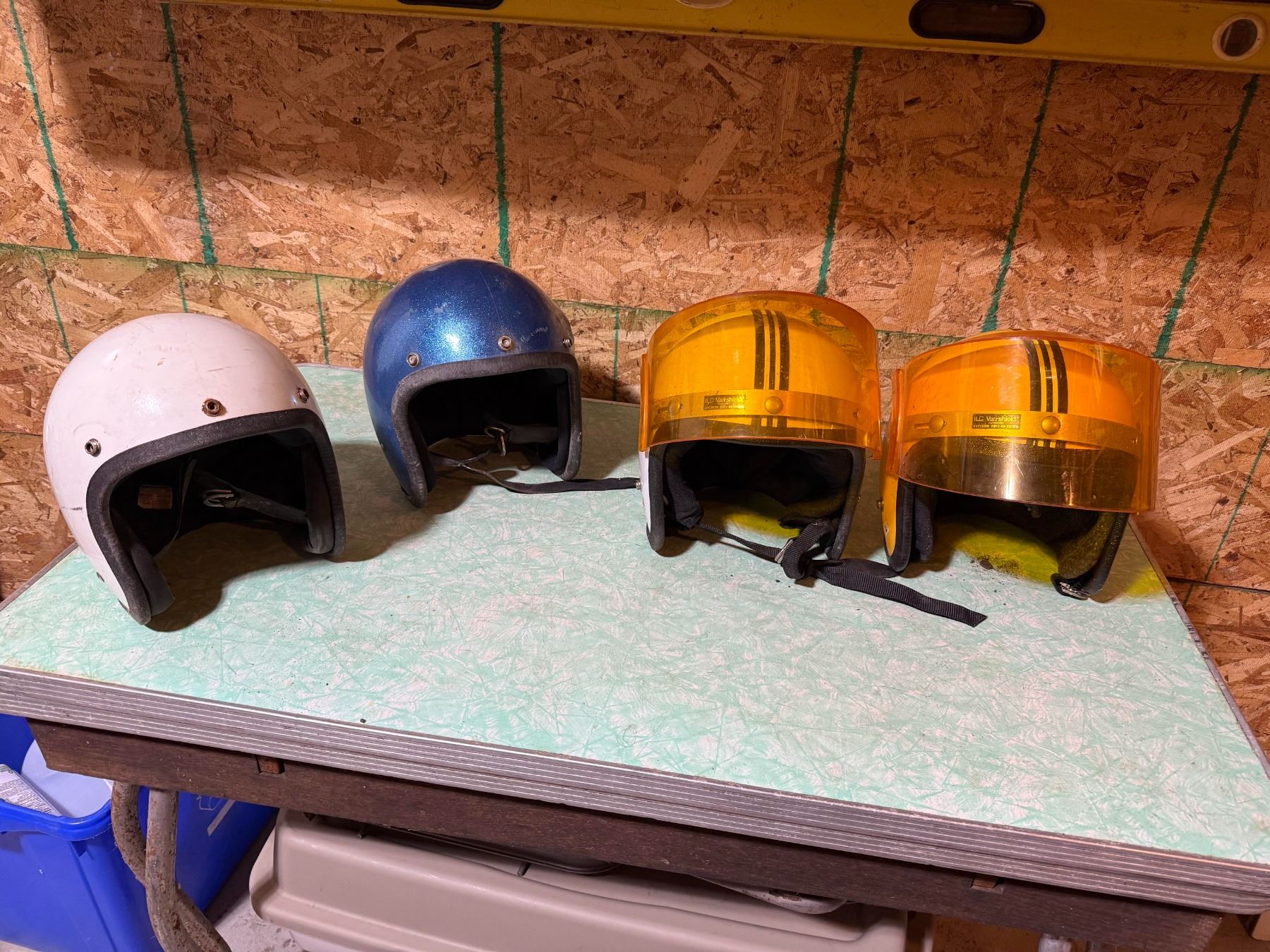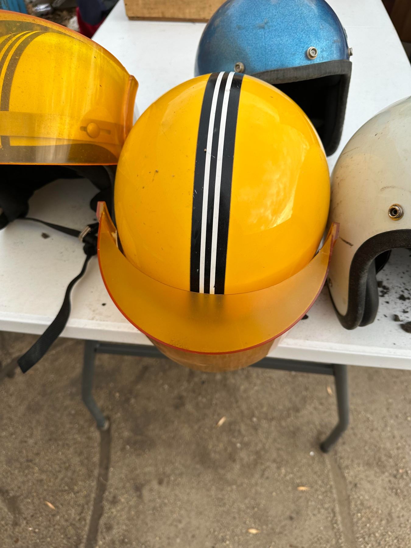 A mixed lot of vintage open-face motorcycle and snowmobile helmets, including two yellow stripe-design helmets with tinted visors, a white helmet with matching visor, a metallic blue open-face helmet, and an additional white helmet. Approx. mid-20th century to later. All pieces show surface wear, scuffs, and age-related marks. Great for retro décor, display, or restoration projects.