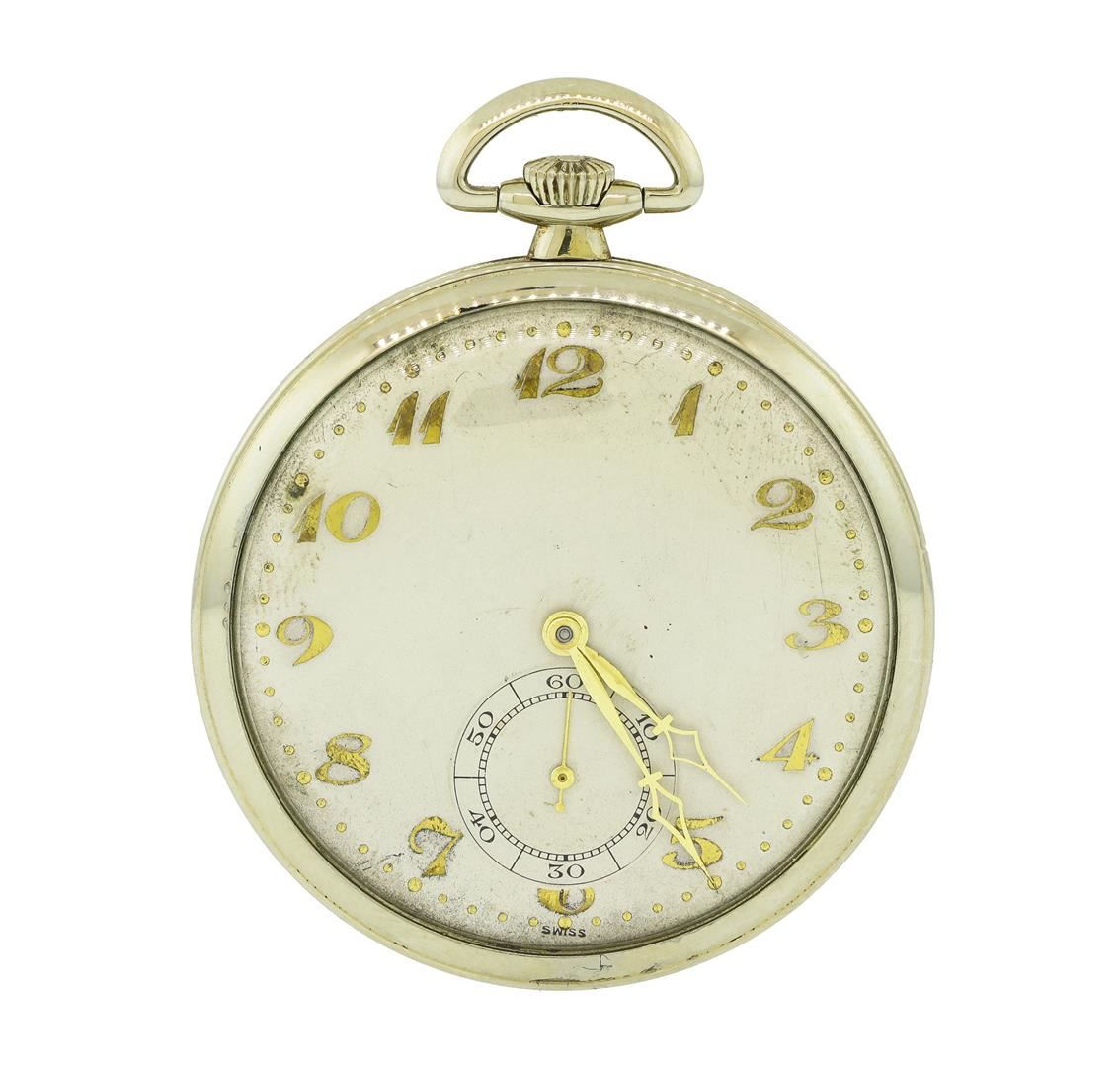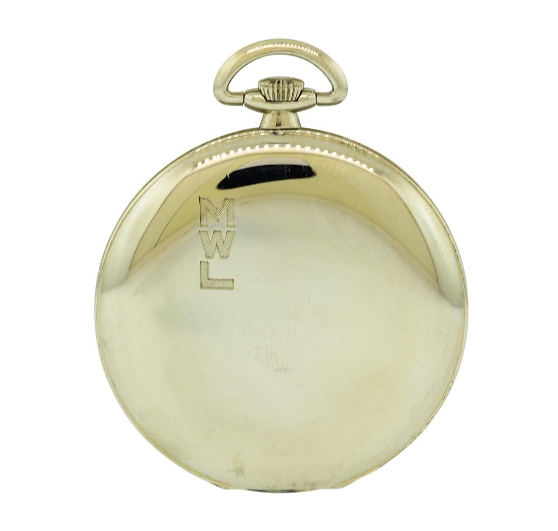 One Movado vintage 18KT White Gold open-face pocketwatch. Movement: Movado, mechanical with manual winding, 17 jewels. Case: Open-Face, 18KT White Gold, measures 45mm in diameter, case number 374676 3714. Case signed "18K 0.750" and engraved "FROM AUNT MARY TO MARVIN MAY 25TH 1928" inside and "MWL" outside. Dial: White enamel with Arabic numerals and gold kite-style hands. Seconds sub-dial is located at 6 o'clock. Condition: G-4 FINE, (good working order and good condition). Total Weight of Watch: 55.00gm.