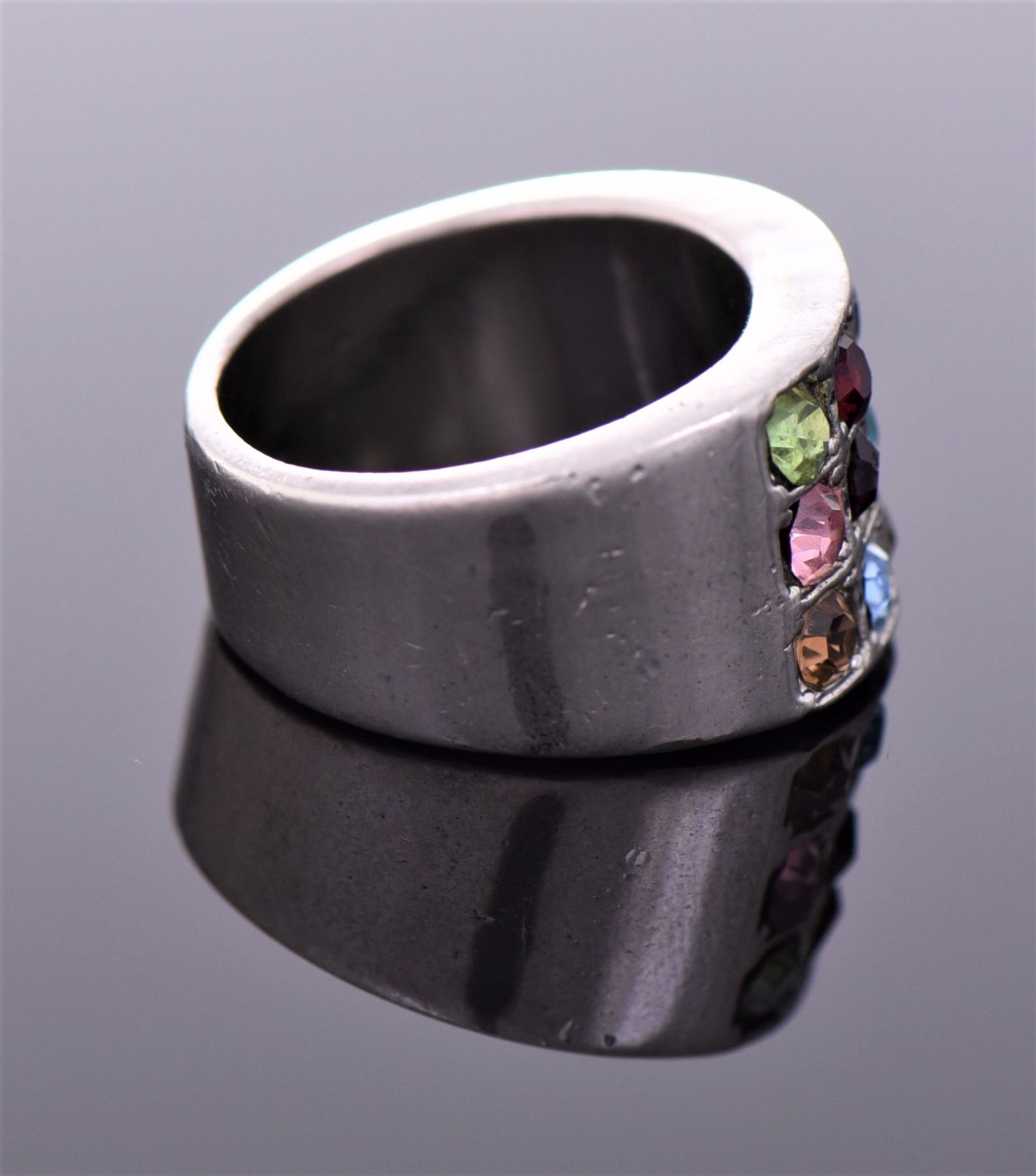Vintage Multi Color Stone Sterling Silver Ring. Silver Tested. Ring Size 9. Estimated more than 50 yrs. old. 925 Sterling Silver consisting of 92.5% silver and 7.5% copper. Tested Positive using Nitric Acid Chemical Scratch Test, Cloth Rub Test, Smell Test, and Magnet Test. No Markings. The reason silver needs to be combined with other metals is that it is very difficult to make great designs with just pure silver, which is very soft and malleable. A bit of hardness has to be introduced by adding other metals such as copper. That is why jewelers are capable of making the most intricate an complex designs with 925 Sterling Silver. Silver is one of the most valuable elements next to gold. Mexico is the leading producer of sliver, followed by the United States, Canada, Australia, Spain, Peru, and Russia. Many countries do not require their precious metal items to be stamped and therefore we test to ensure we accurately represent the product. Size and/or Weight: See Measurement Photo. (Photos Represent The Lot Condition, Pangaea Auctions)