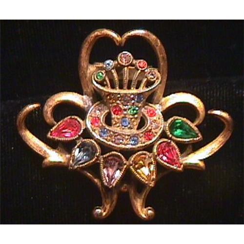 What a find ! Take a look at this spectacular vintage multi colored rhinestone costume jewelry dress / fur clip . Unknown maker . Brass or brass over metal . Measures 1 3/4 " long x 1 1/2 " wide. Excellent overall used condition , has a nice patina , no missing rhinestones. Comes with free presentation box. You'll want to wear this one often !