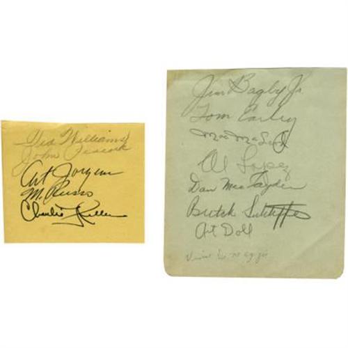 <B>Vintage Multi-Signed Album Pages Lot of 2 with Ted Williams and Vince DiMaggio.</B></I> Great pair of vintage signed pages from some of the most esteemed baseball stars of yesteryear. Highlights of this collection include a vintage Ted Williams signature as well as an entry from Vince DiMaggio. Other notables include Charlie Keller and Al Lopez. <I>LOA from PSA/DNA.</B></I><BR><BR><b>Shipping:</b> Flat Material, Small (<a target="_blank" href="http://www.heritageauctions.com/common/shipping.php">view shipping information</a>)