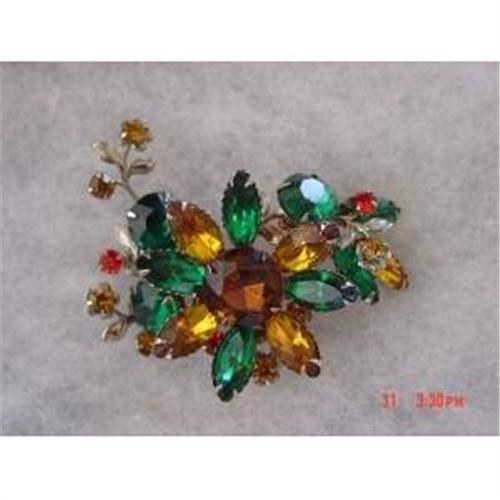Here is a wonderful vintage estate multicolored rhinestone brooch, there are green, amber, red colored rhinestones. All stones are hand placed and held firmly intact by prongs. Excellent condition.