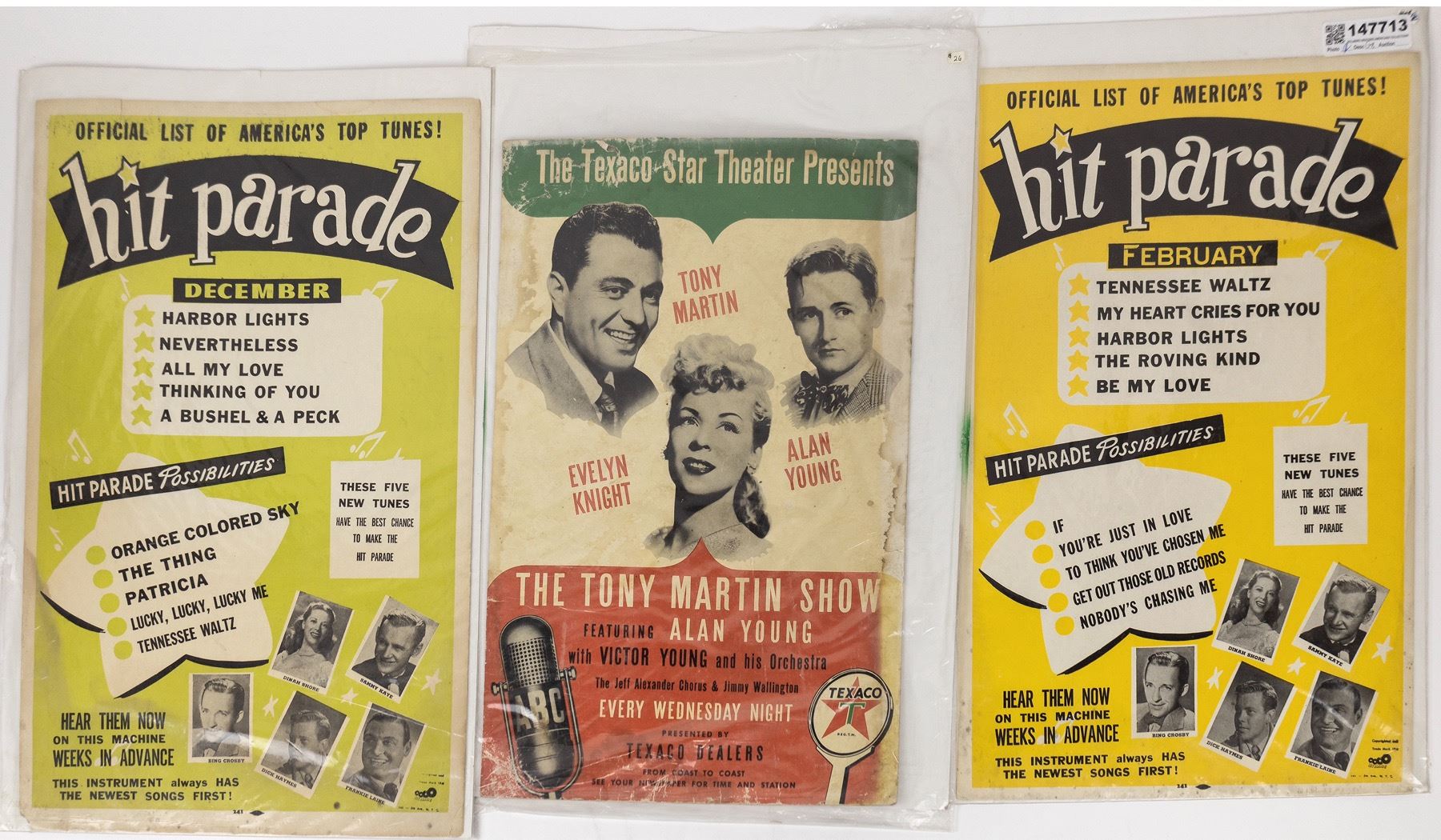 Hit parade, February and December with Bing Crosby, Dina Shore... Texaco Star Theatre with Tony Martin. About 19.5x13". City: State: Date:
