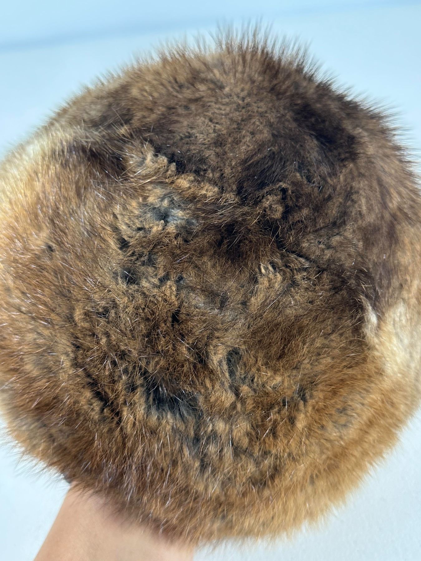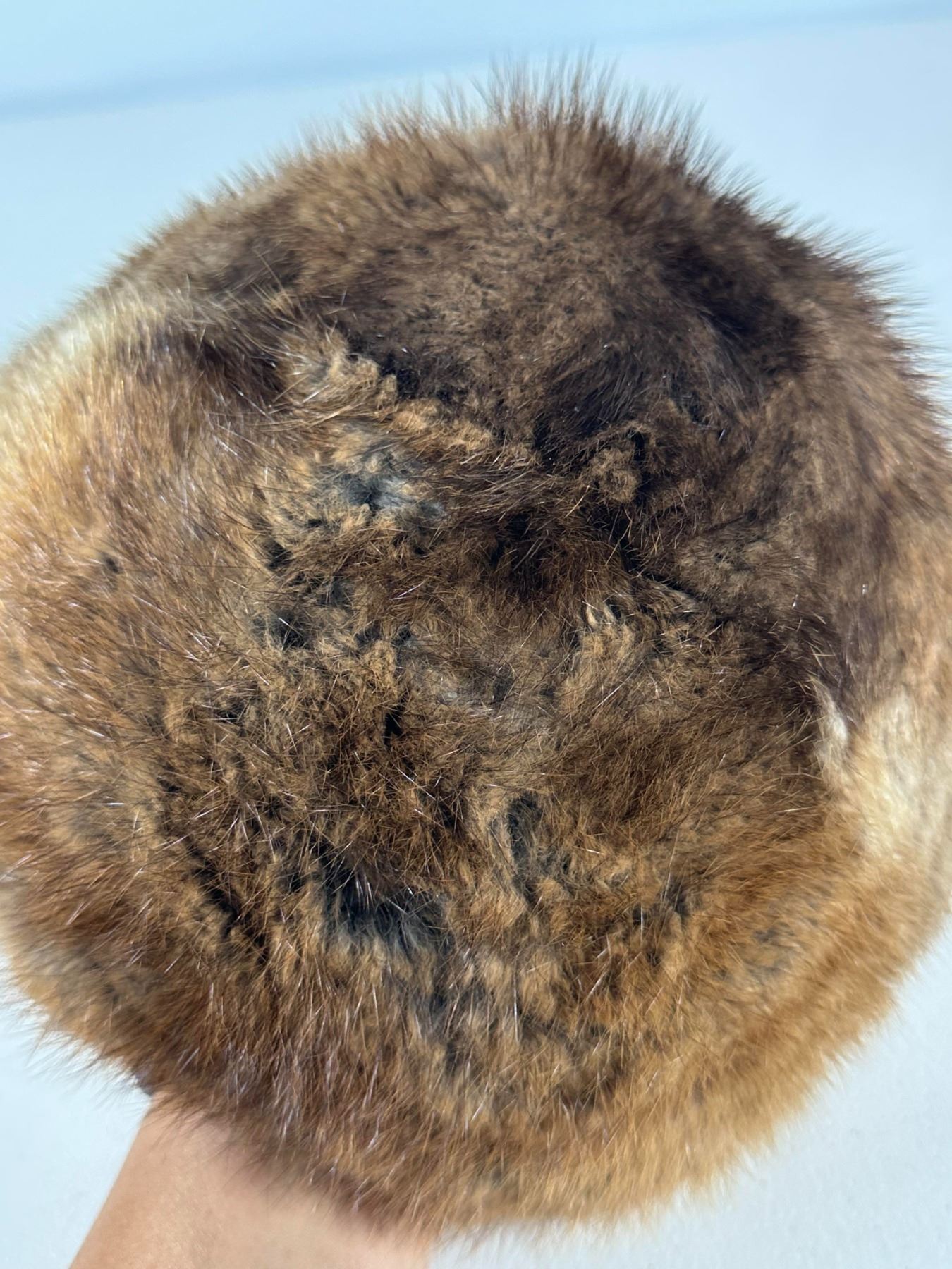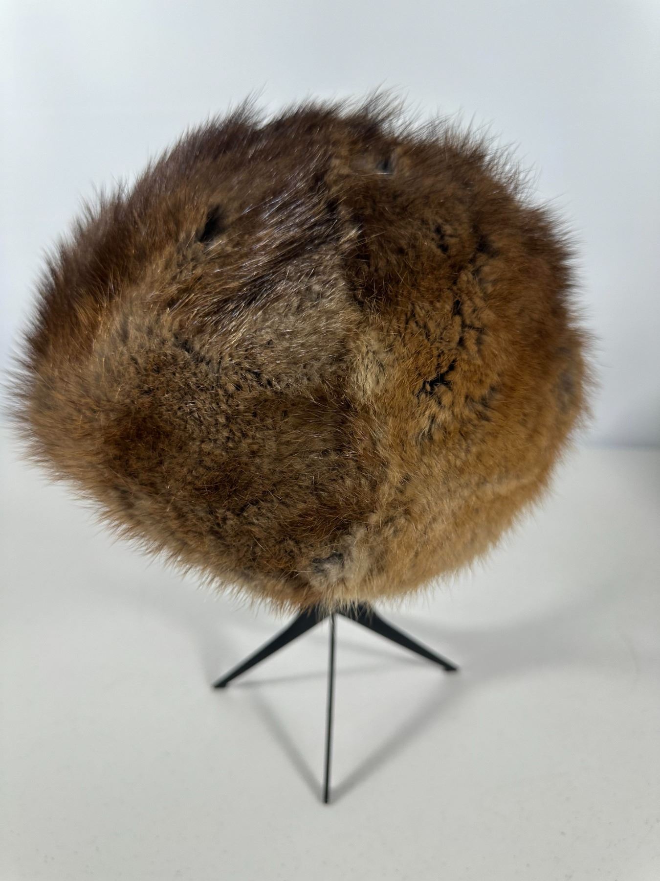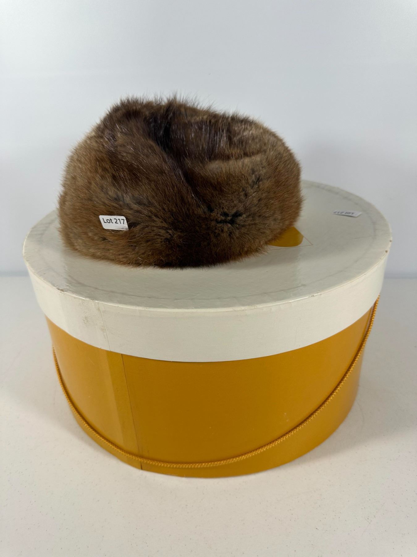 Warm brown muskrat hat in pillbox form; housed in a round Hudson’s Bay Company (The Bay) hat box (box not original).
