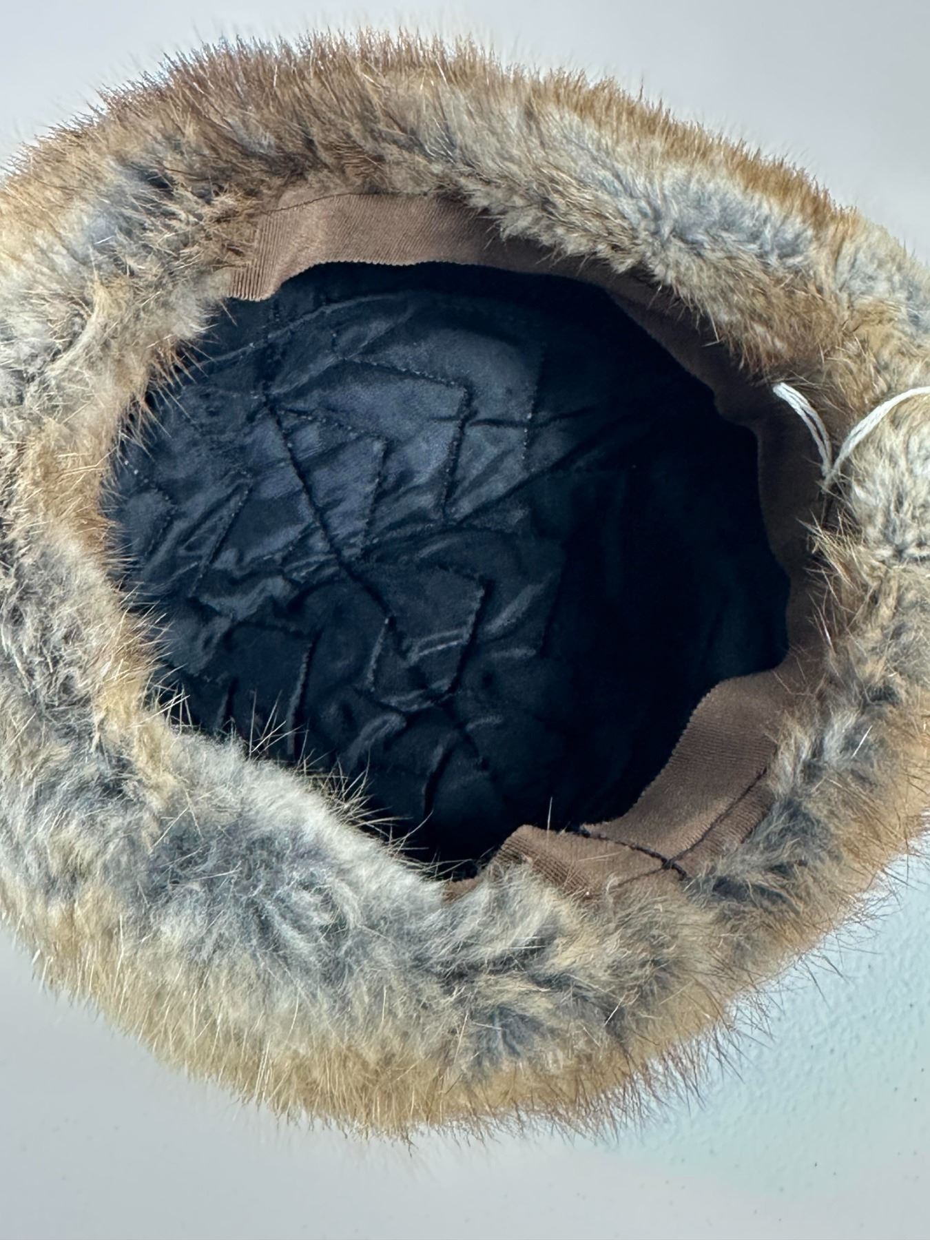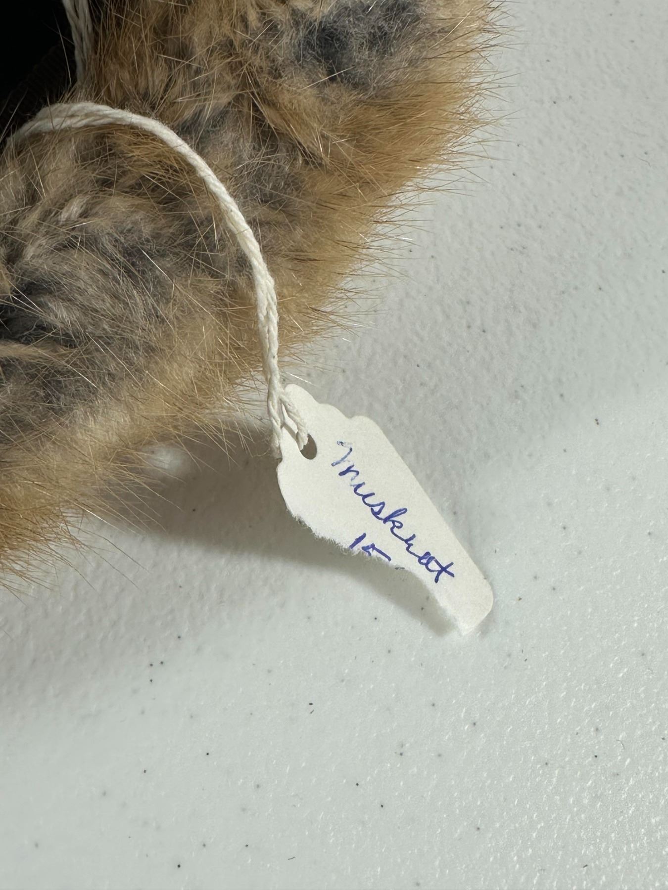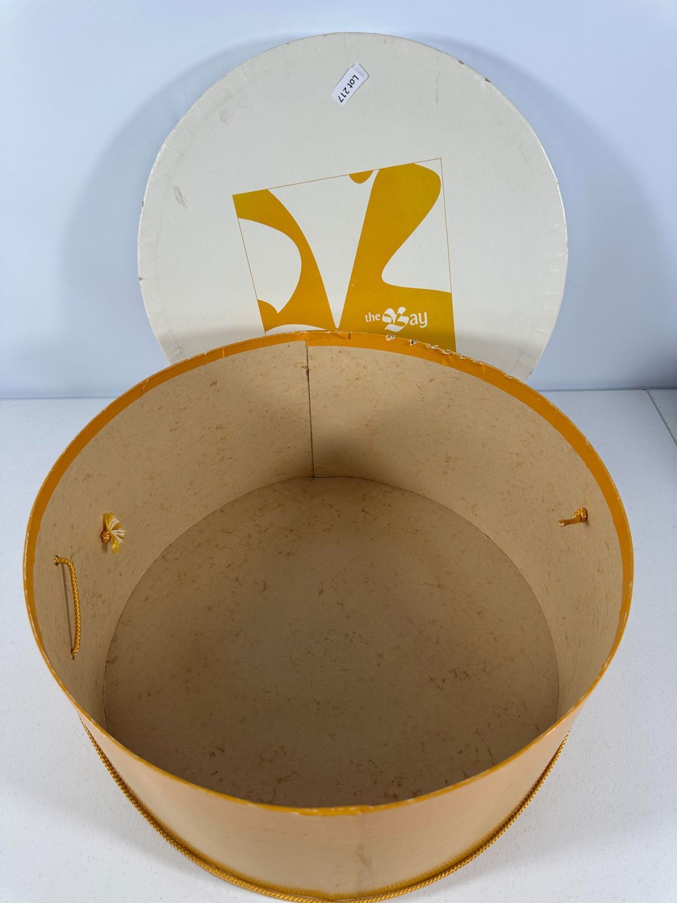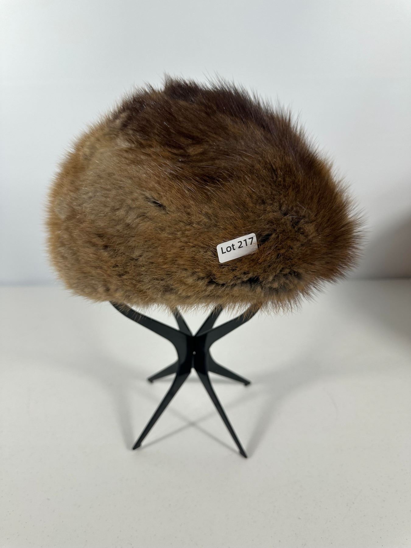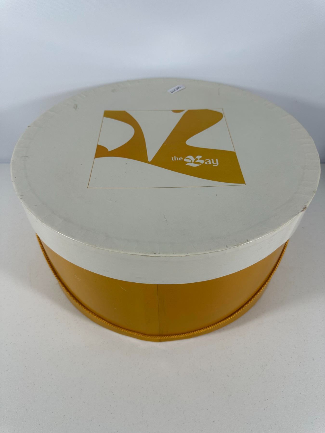 Warm brown muskrat hat in pillbox form; housed in a round Hudson’s Bay Company (The Bay) hat box (box not original).