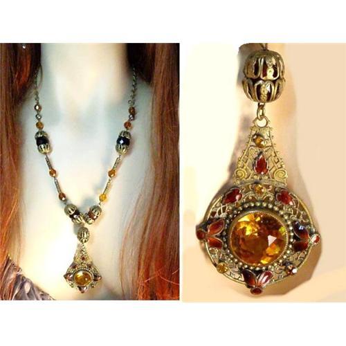 The size of this is not comparable to the photos because each of the pieces of this are well over size and rich in old brass patina ( see photo next to a DIME) . The Drop has ENAMEL and golden glass rhinestones with a center glass piece that is faceted in the shape of a star with an open pointed back. This solid heavy 3" long pendant has layers of filigree and is one of the nicest ones I have seen. The center stone is just GORGEOUS with many many facets.