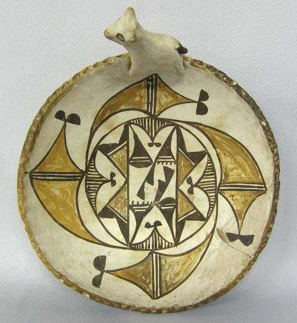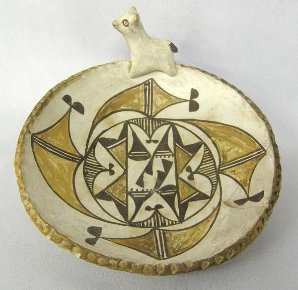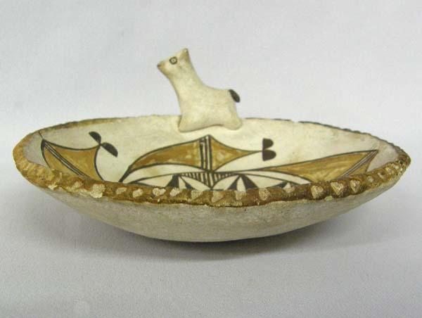 Vintage Native American Acoma Bowl with Effigy Animal on rim. Has been broken and repaired. Measures approx. 1.25''H, with animal 2.25''Hx5.25''W. Buyers Pay Actual Shipping and Handling Charges(see terms and conditions for more information).