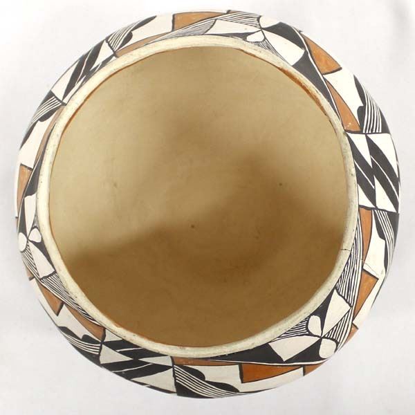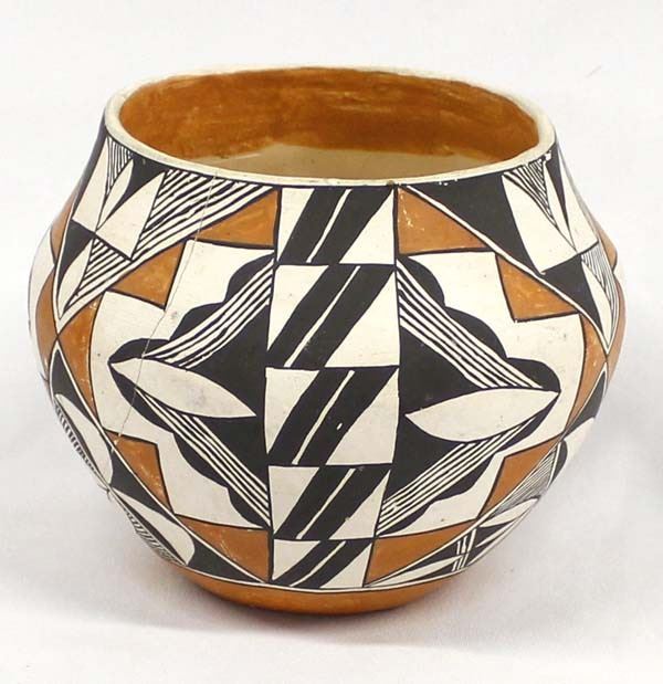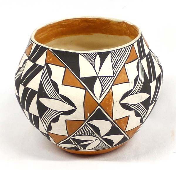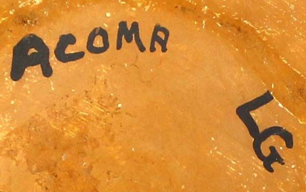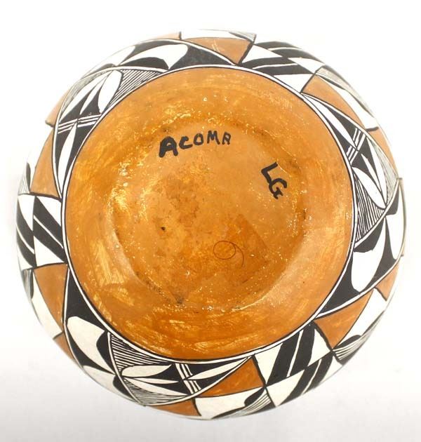Historic/Vintage Native American Acoma Pottery Bowl by Garcia, artist's initials LG on the bottom, measures 5'' x 6'', has about a 3'' pressure crack