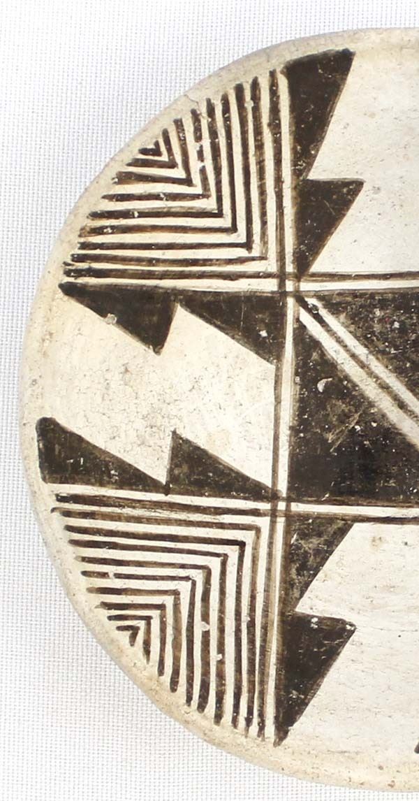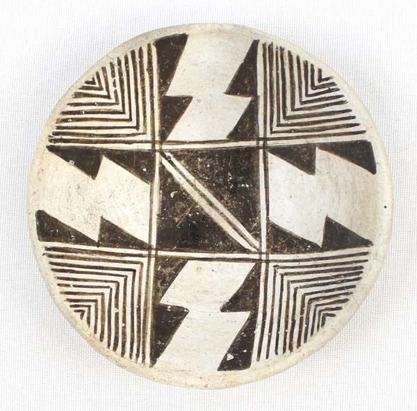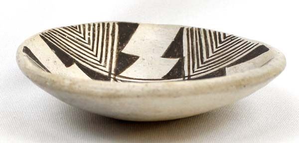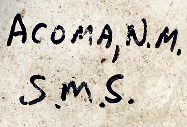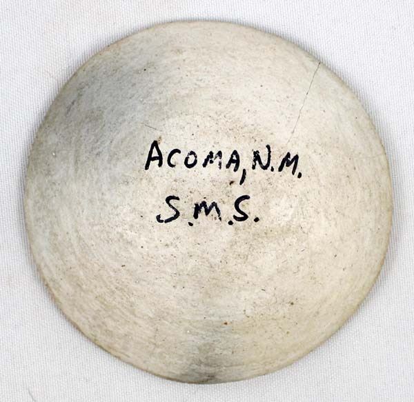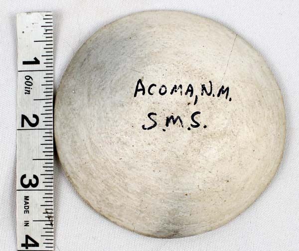 Vintage Native American Acoma Pottery Shallow Bowl, measures 1'' x 3.75''D and has artist's initials on the bottom S.M.S., ca. 1940-1950