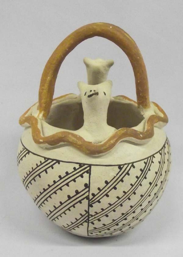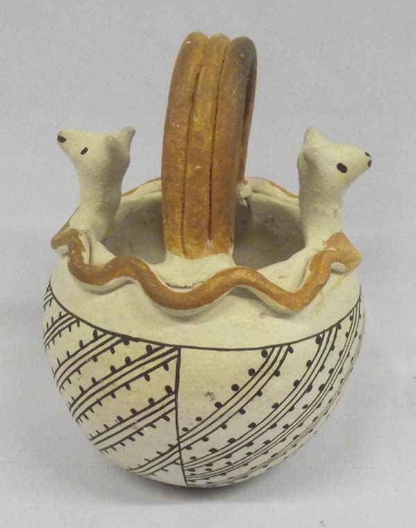 Vintage traditional Acoma pottery, basket with animals on each side, measures approx. 6 x 5 inches. Buyers Pay Actual Shipping and Handling Charges(see terms and conditions for more information).
