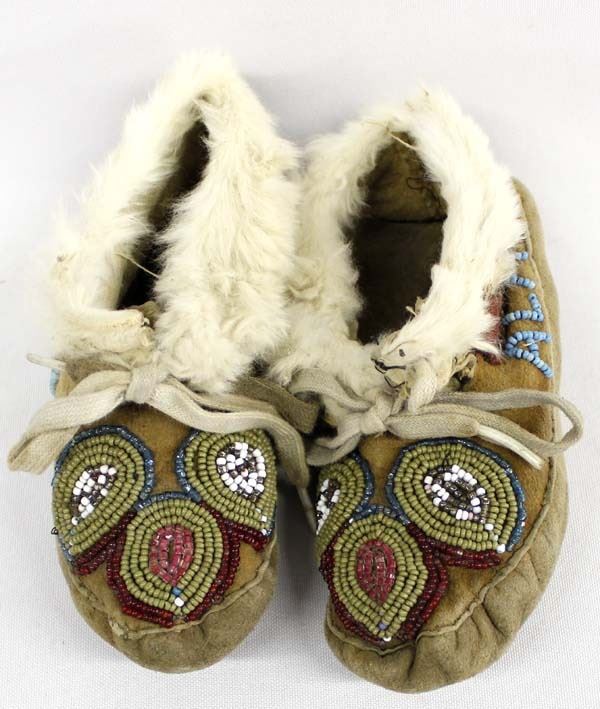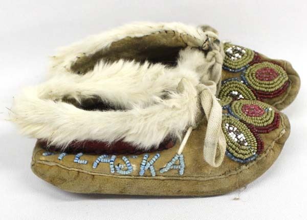 Vintage Native American Alaskan Eskimo Beaded Child's Moccasins, measure 7''L heel to toe, beautiful beadwork, trimmed in lapin fur, shoestring ties, the word Alaska is beaded on the outer sides