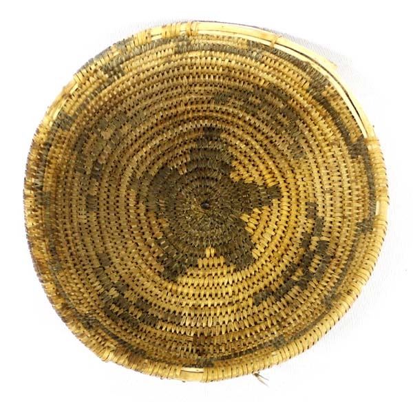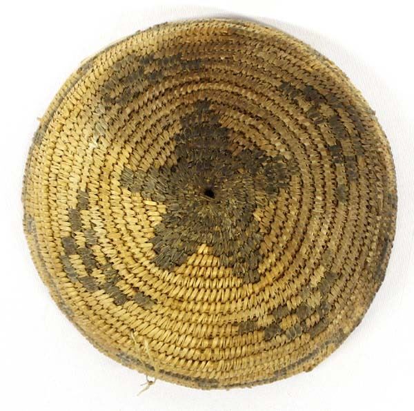 Antique/Vintage Native American Apache Basket, measures 1.25'' x 5.5'', star and stairstep cloud patterns inside of bowl, some rim damage