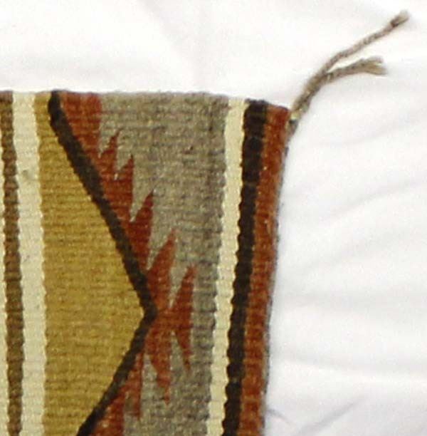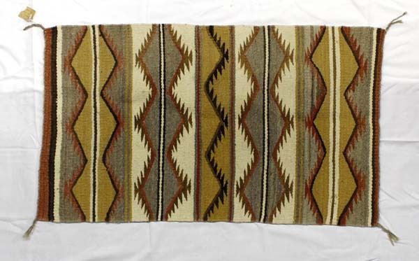 Vintage Native American Chinle Wool Textile Rug, measures 24'' x 41'', stunning earthtone colors in a nice tight weave, 4 cornered tassels intact, vegetal dyed, has partial original tag still attached, weaver's name appears to be Frances D. from Canoncito (NM) from what I can tell