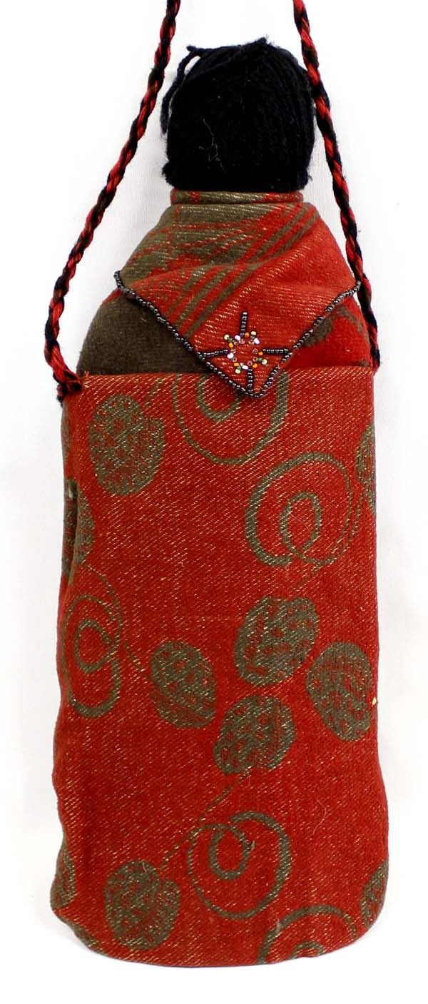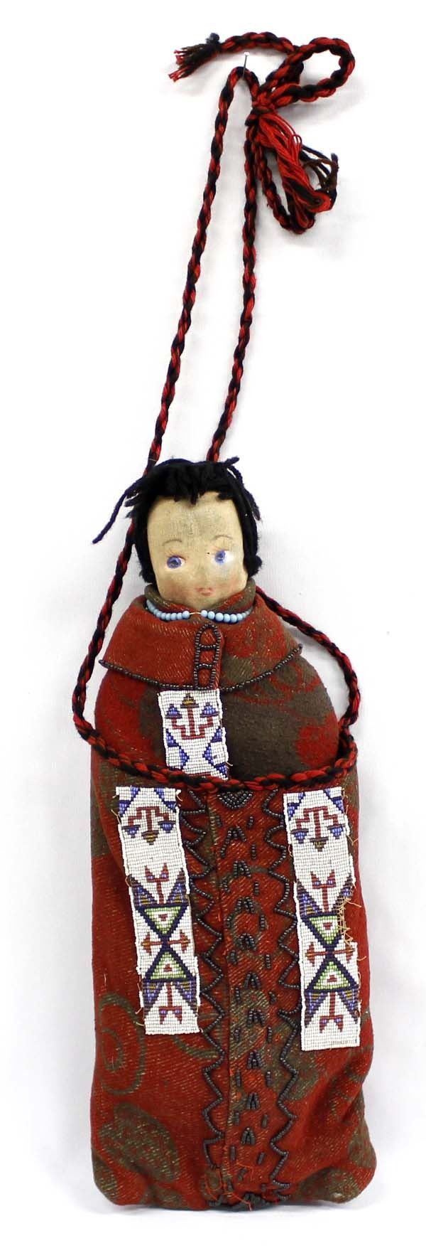 Vintage Native American Cloth Doll in Beaded Purse, the robe that the doll is wearing is also embellished with beadwork on front and back, measures 18'' x 6.5'', doll has cloth head with painted on face and yarn hair