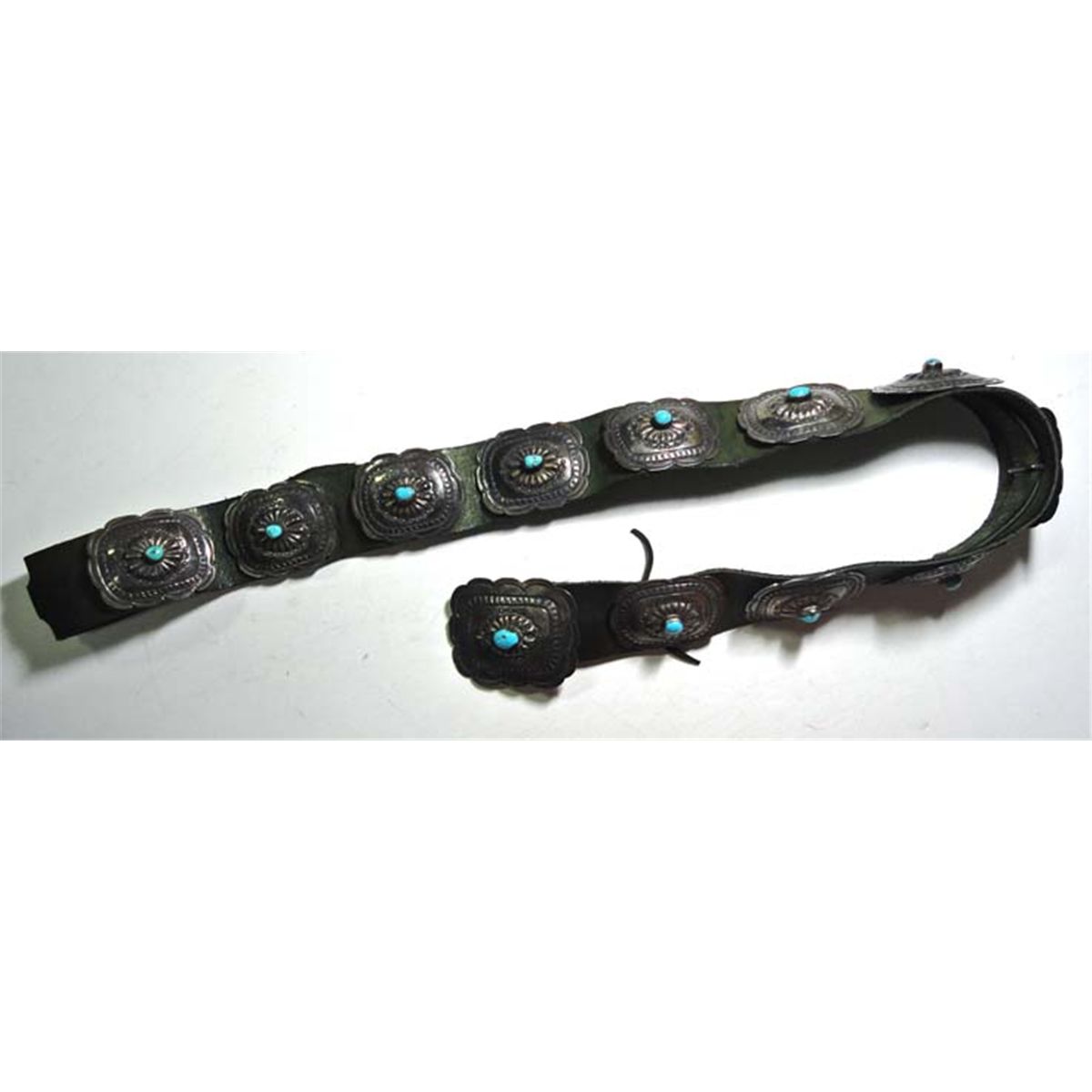 Stunning vintage Native American Concha Belt. 12 silver conchas with bezel set turquoise stone. Signed with a T circle with a dot in the middle and a M. There is at least 12 ounces of sterling here. The original price on this in the 50's or 60's was $1200. Truely a collector's and museum piece!"