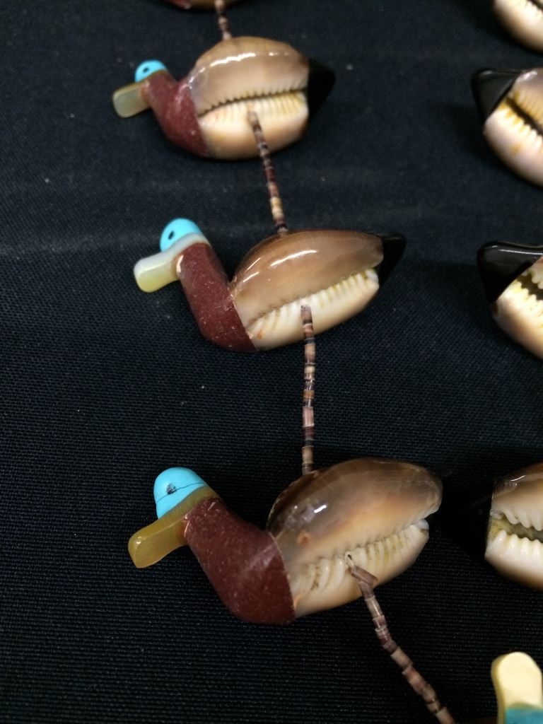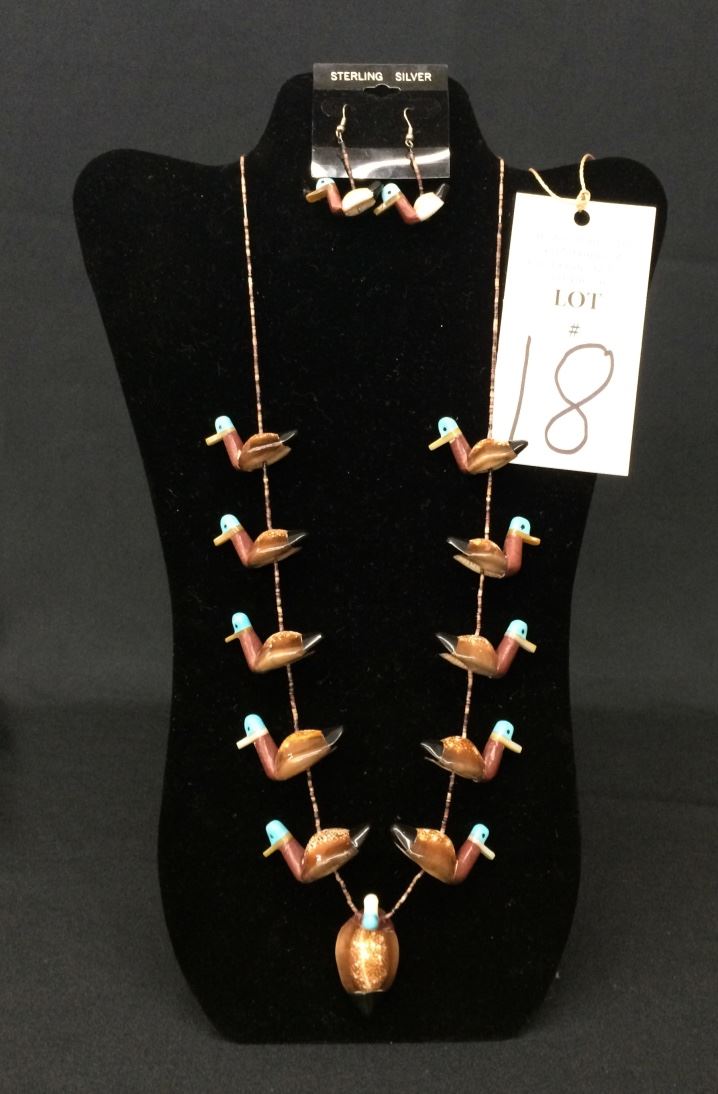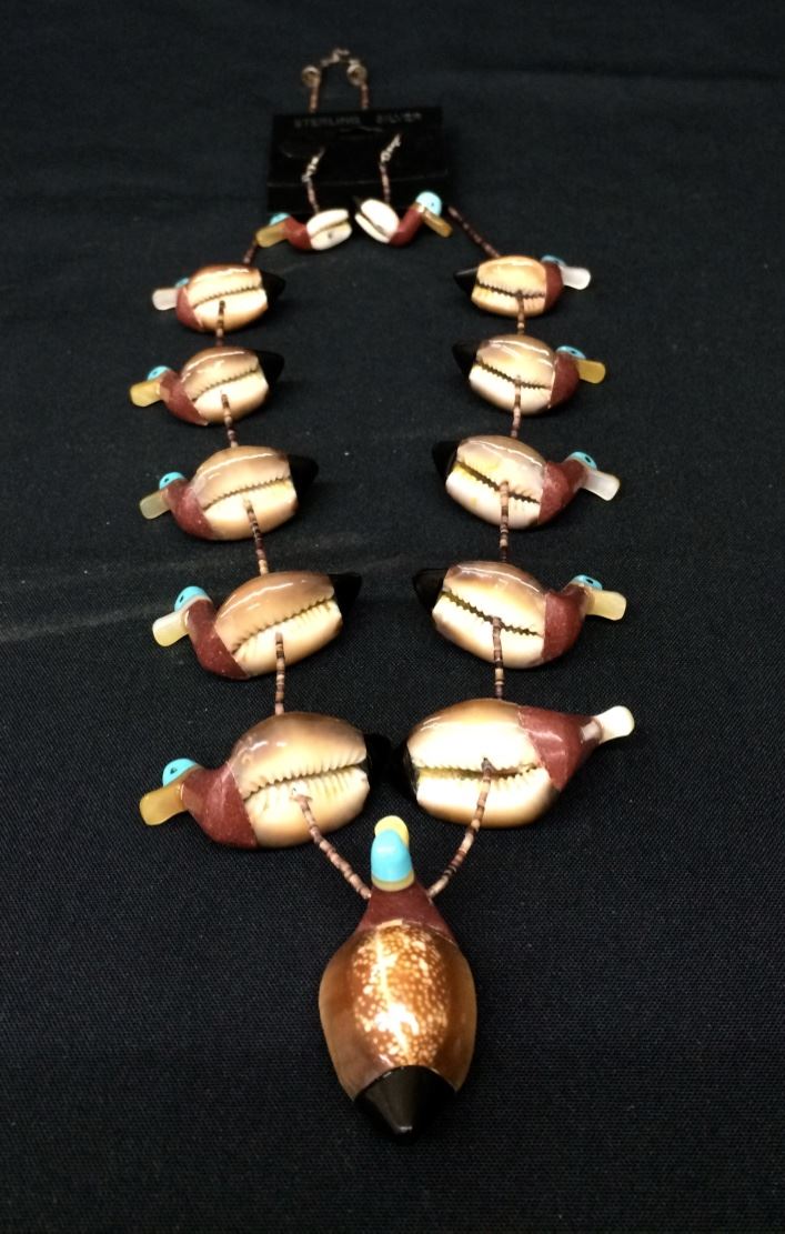 This Zuni or possibly Santo Domingo fetish necklace features 13 individually carved ducks with matching earrings. Fits approx. 26” around the neck and is finished off with sterling cones / findings. These ducks have longer necks than you normally see which lends toward it being a more vintage piece. Circa 1960s - 70s. Good condition. Shipping: There will be a $5 handling / packaging fee for shipping this lot. The actual cost of postage will be added on top of that.