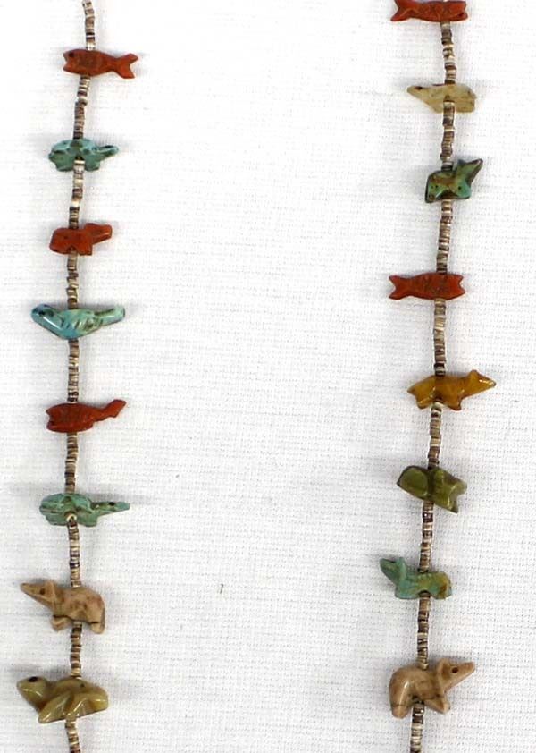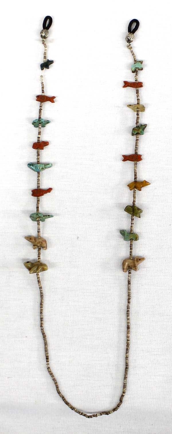 Vintage Native American Fetish and Fine Shell Heishi Eyeglass Holder, measures 24''L end to end, thread on one side near end is frayed, nice variety in stones and animal fetishes
