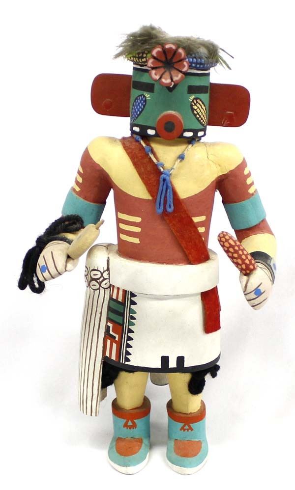 Vintage Native American Hopi Corn Kachina, measures 6'' x 12'' x 4.5'', embellished with feathers, yarn, and leather, missing item off of the back of his head, right foot and left arm has been glued