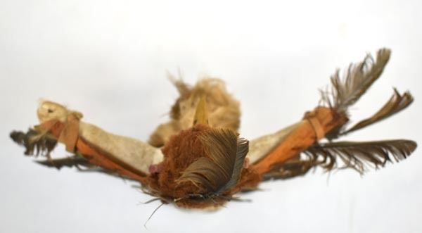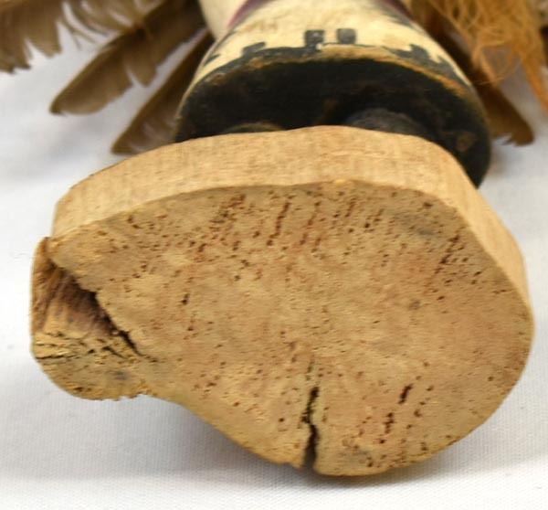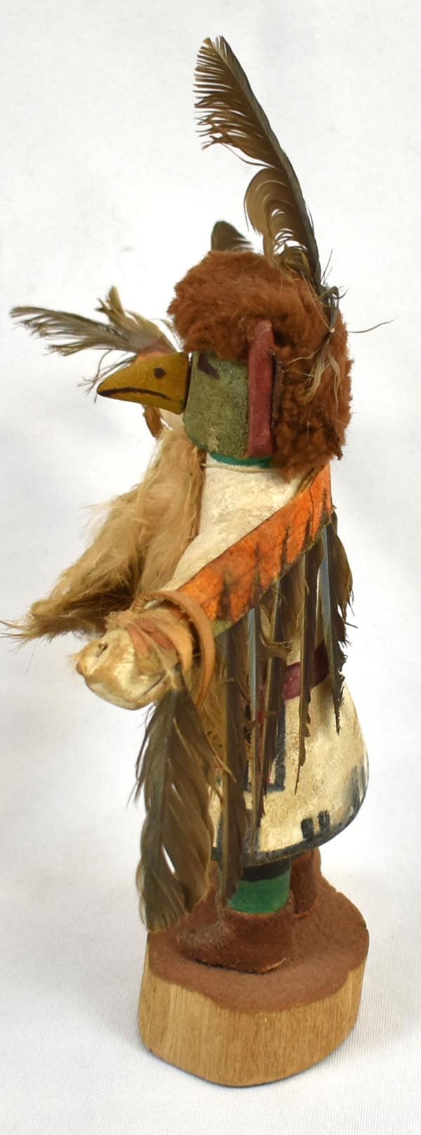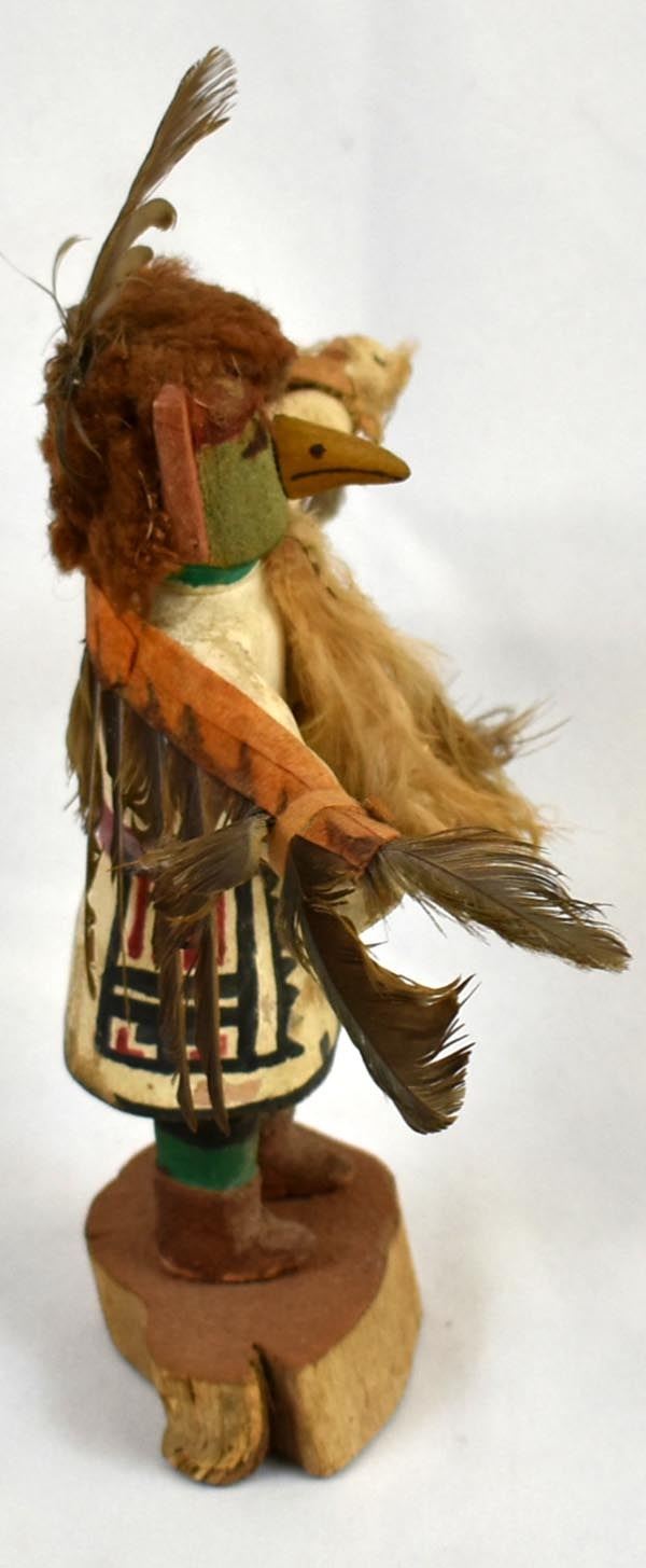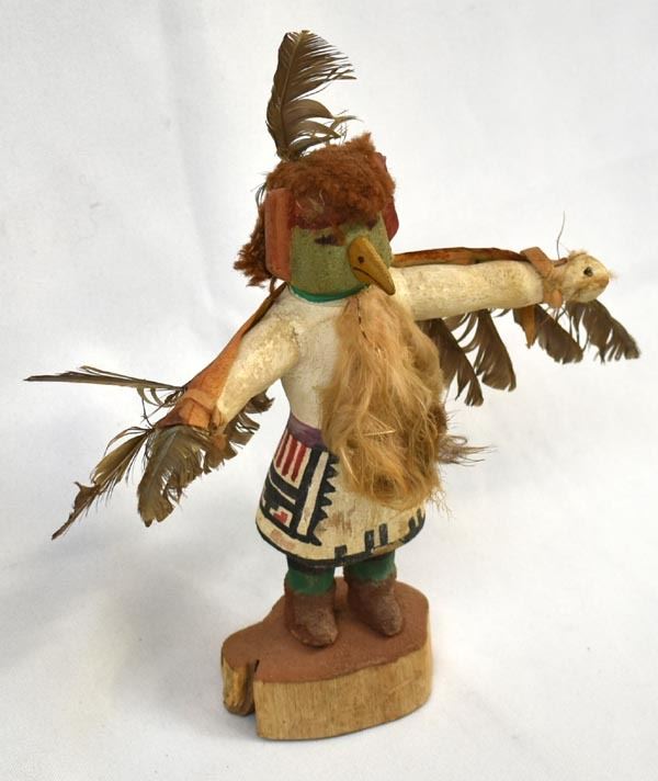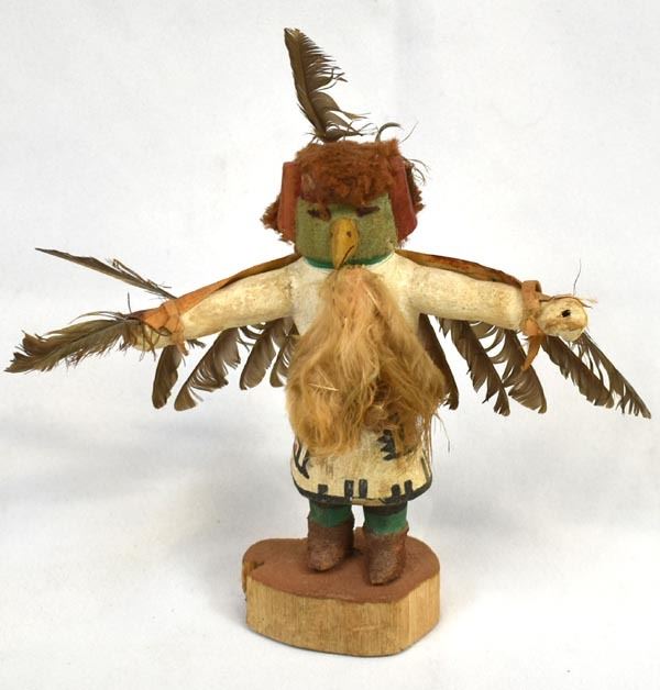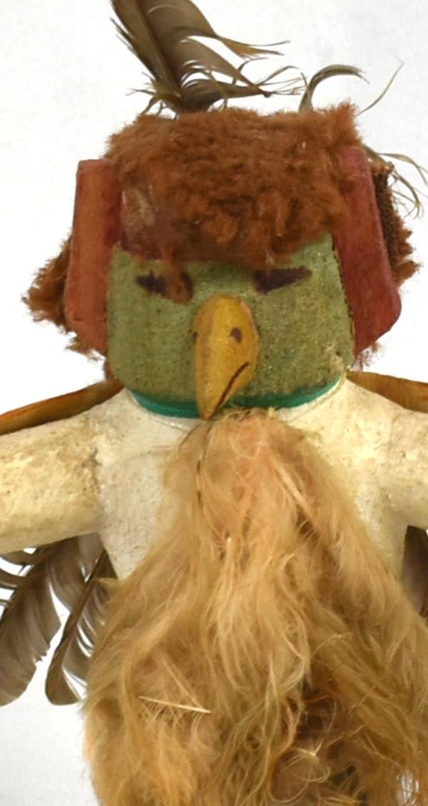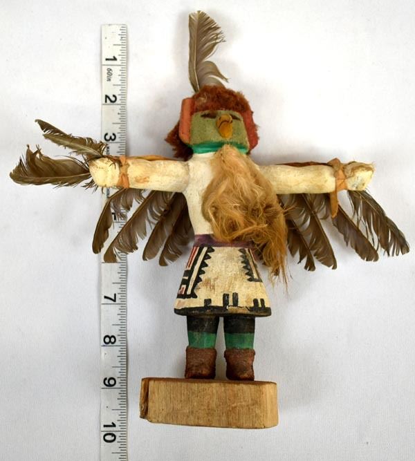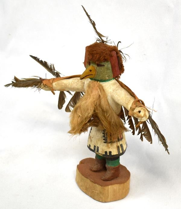 Vintage Native American Hopi Eagle Kachina, measures 9'' x 8'' x 3'', embellished with feathers, yarn, and leather, feather damage