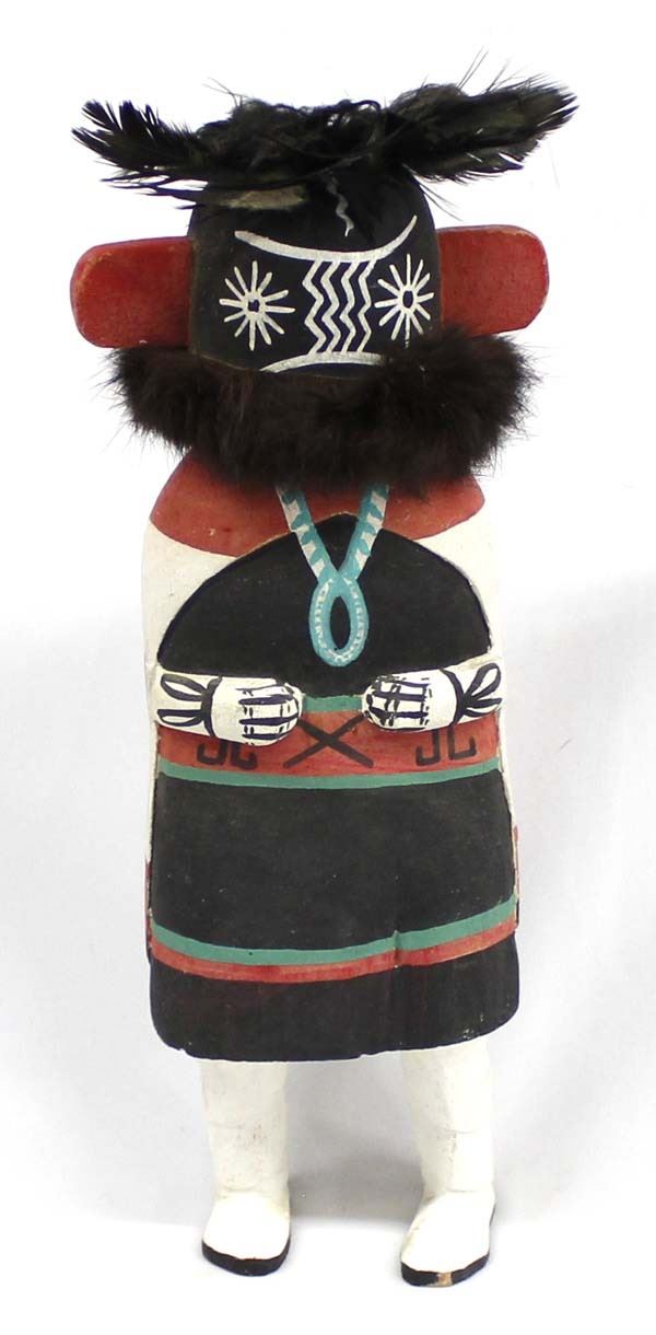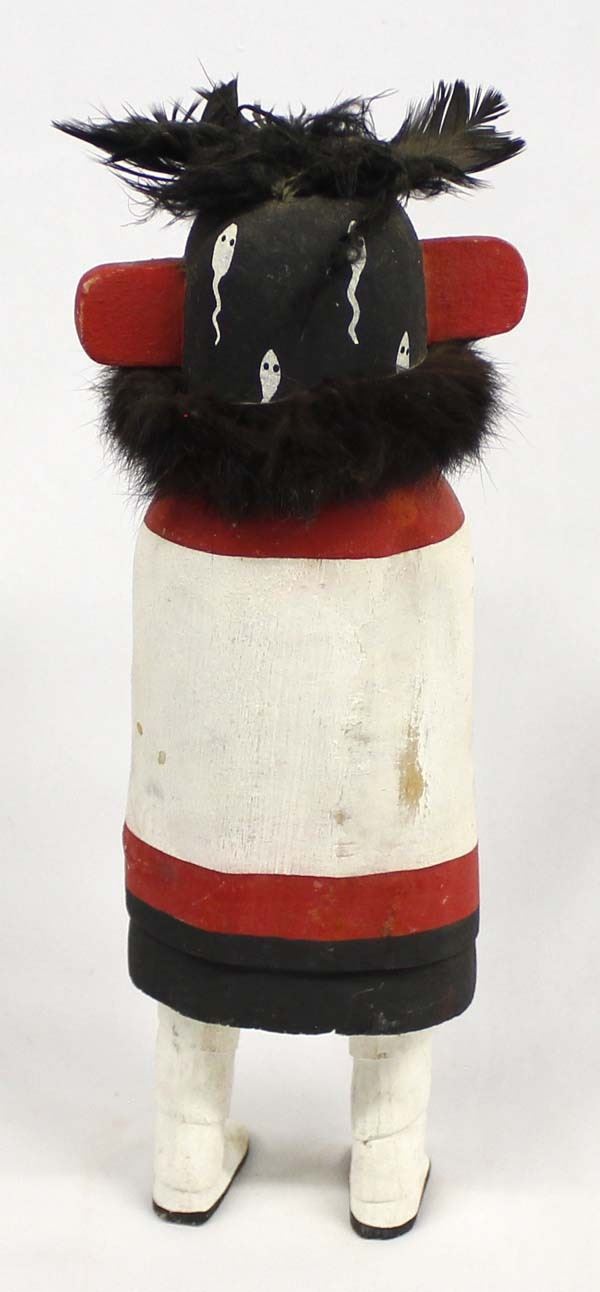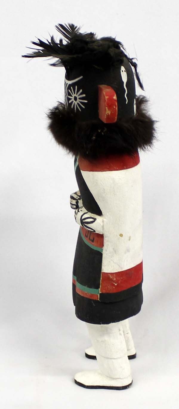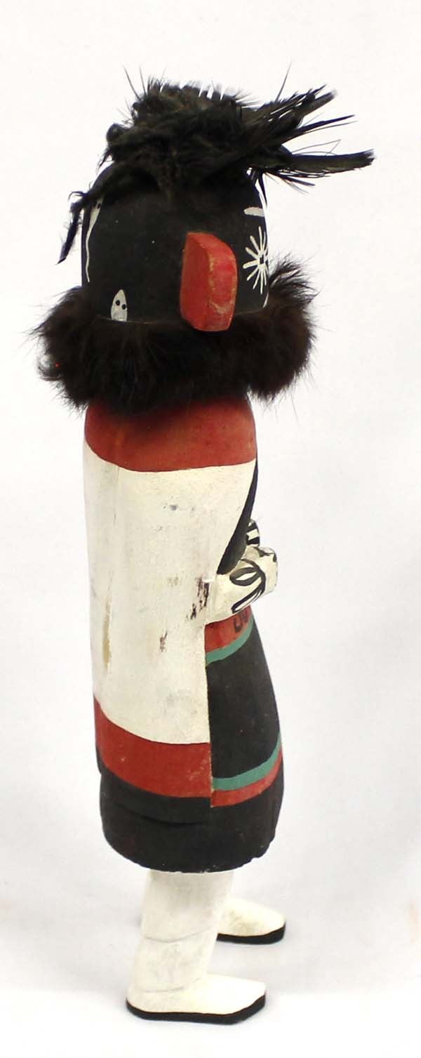 Vintage Native American Hopi Hoho Mana Kachina, measures 12.5''H x 4.5''W, embellished with feathers and fur, ''She represents the tadpoles of the spring. symbolizes moisture of the summer rains to ensure good crops for the Hopi people.''