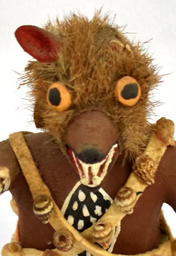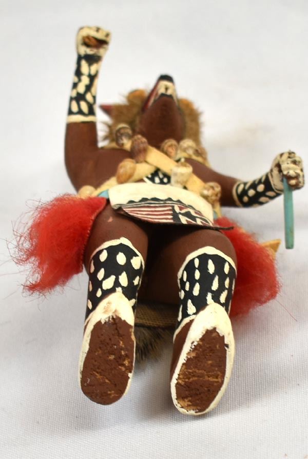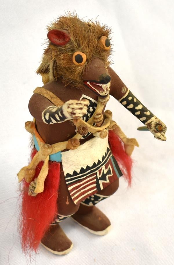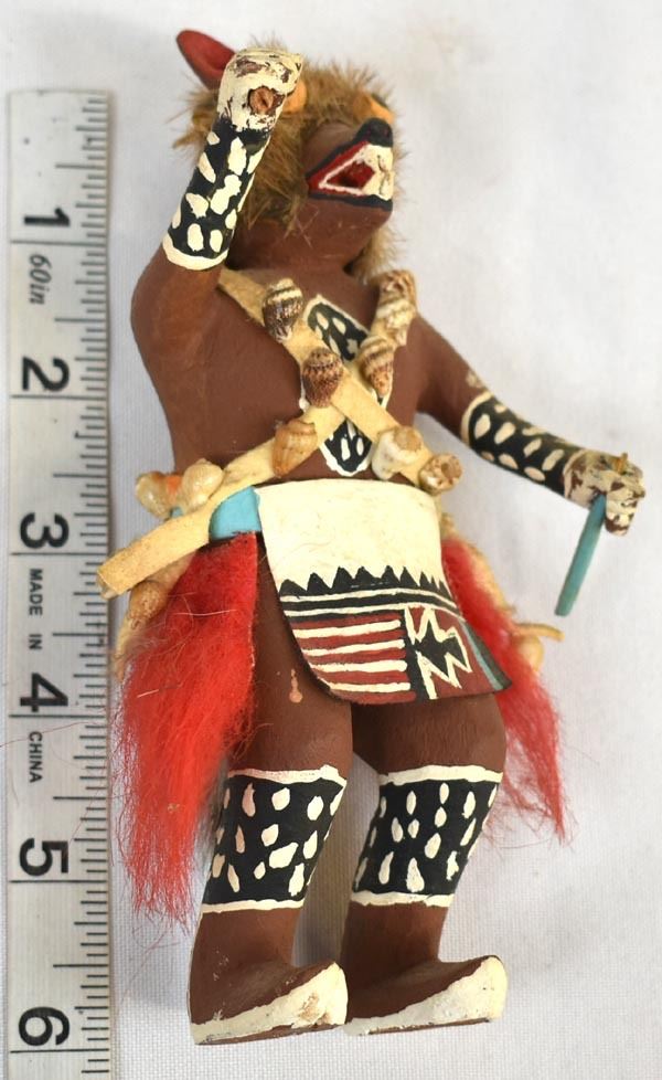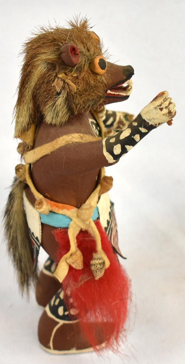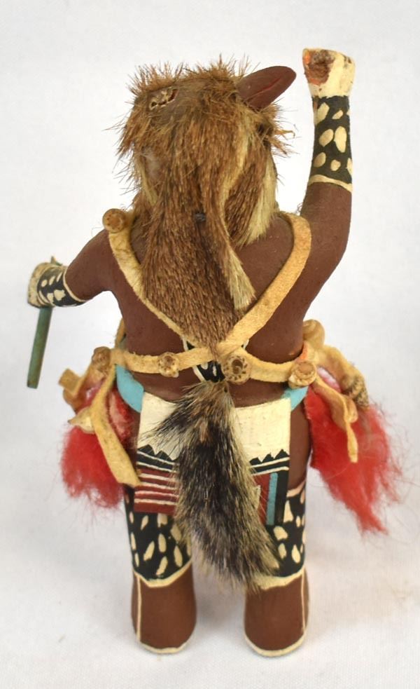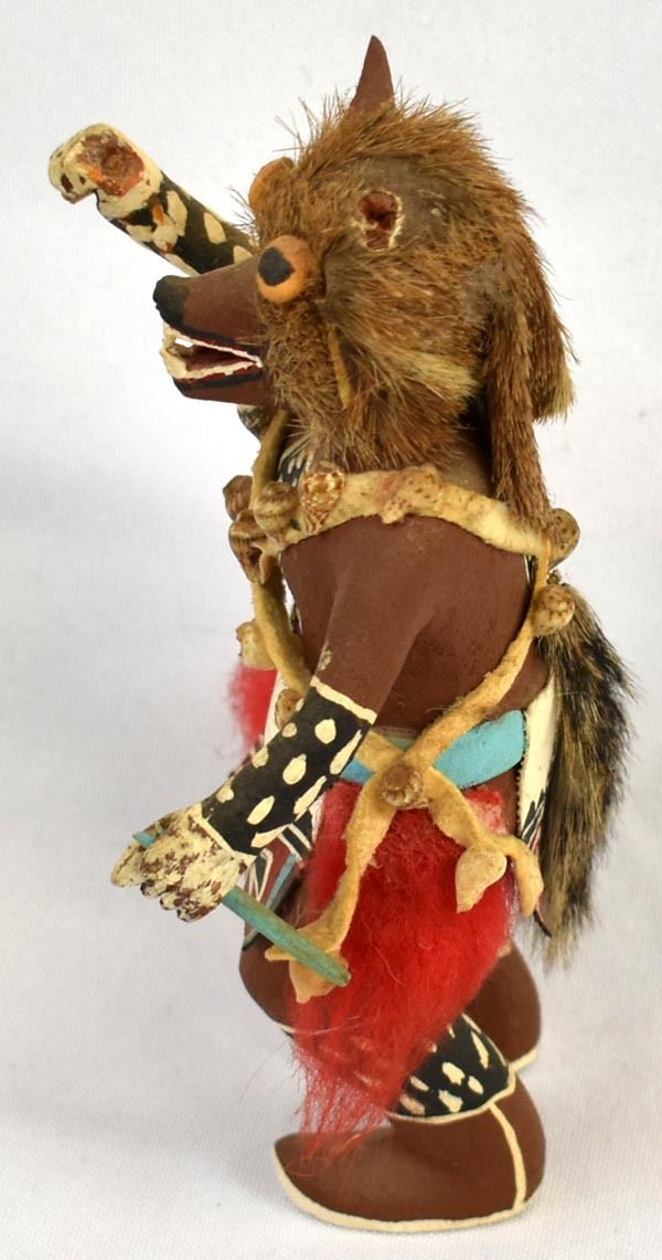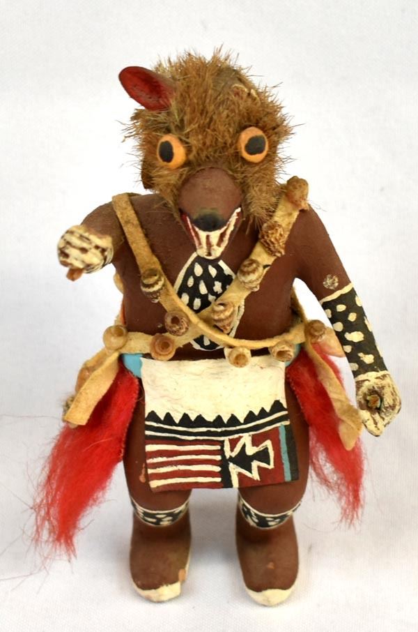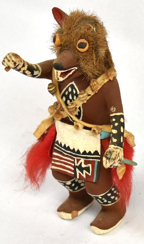 Vintage Native American Hopi Wolf Kachina, measures 3'' x 6 x 2'', missing left ear, embellished with rabbit fur, shells, leather, faux fur, and painted cloth