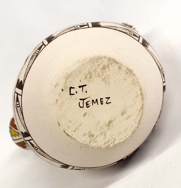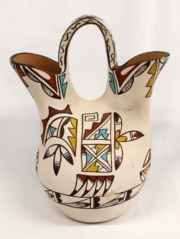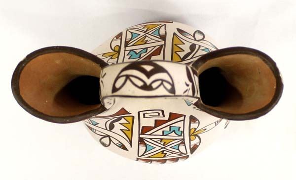 Vintage Native American Jemez Pottery Wedding Vase, measures 11'' x 8'', artist's initials on the bottom, chipping on both spouts and rub spots in paint