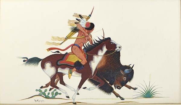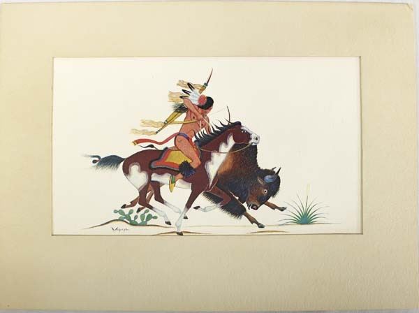 Vintage Native American Kiowa Print by Stephen Mopope, visual measures 5'' x 8'', FYI: ''Stephen Mopope (1898-1974) was a Kiowa painter, dancer, and flute player of Spanish descent, from Oklahoma. He was the most prolific member of the Kiowa Five. Stephen Mopope was born on 27 August 1898 near the Redstone Baptist Mission on the Kiowa Reservation in Indian Territory.''