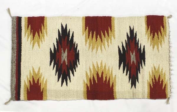 Vintage Native American Navajo Wool Textile Rug, measures 25'' x 18'', fringed on one end, 4 cornered tassels intact