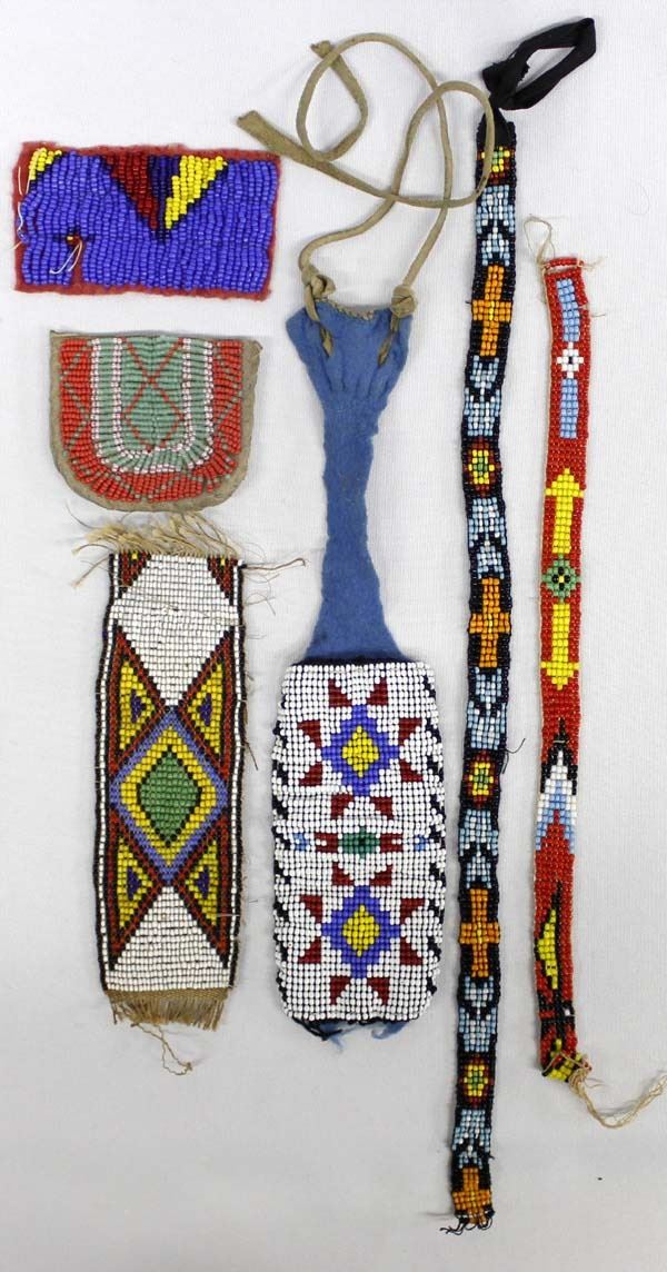 Antique/Vintage Native American Plains Indian Beadwork, largest measures 18.5''L (includes leather ties) x 2.25''W, 6 pieces total