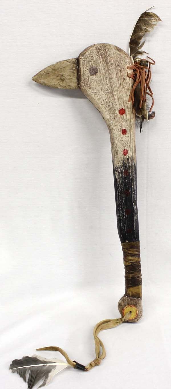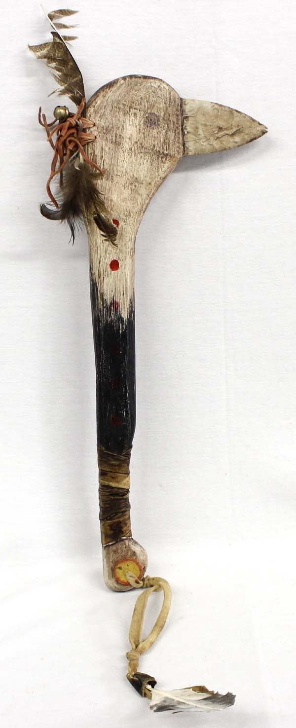 Vintage Native American Plains Indian Tomahawk, measures 8'' x 21'' x 1'', bird form with larged carved arrowhead beak (tomahawk), embellished with leather, bells, and feathers, leather wrapped handle, hand painted, arrowhead beak measures 3.5'' x 2.25''
