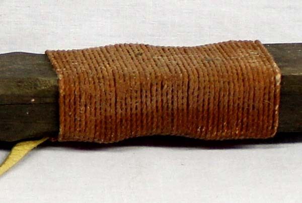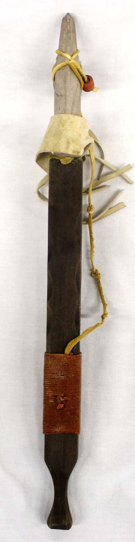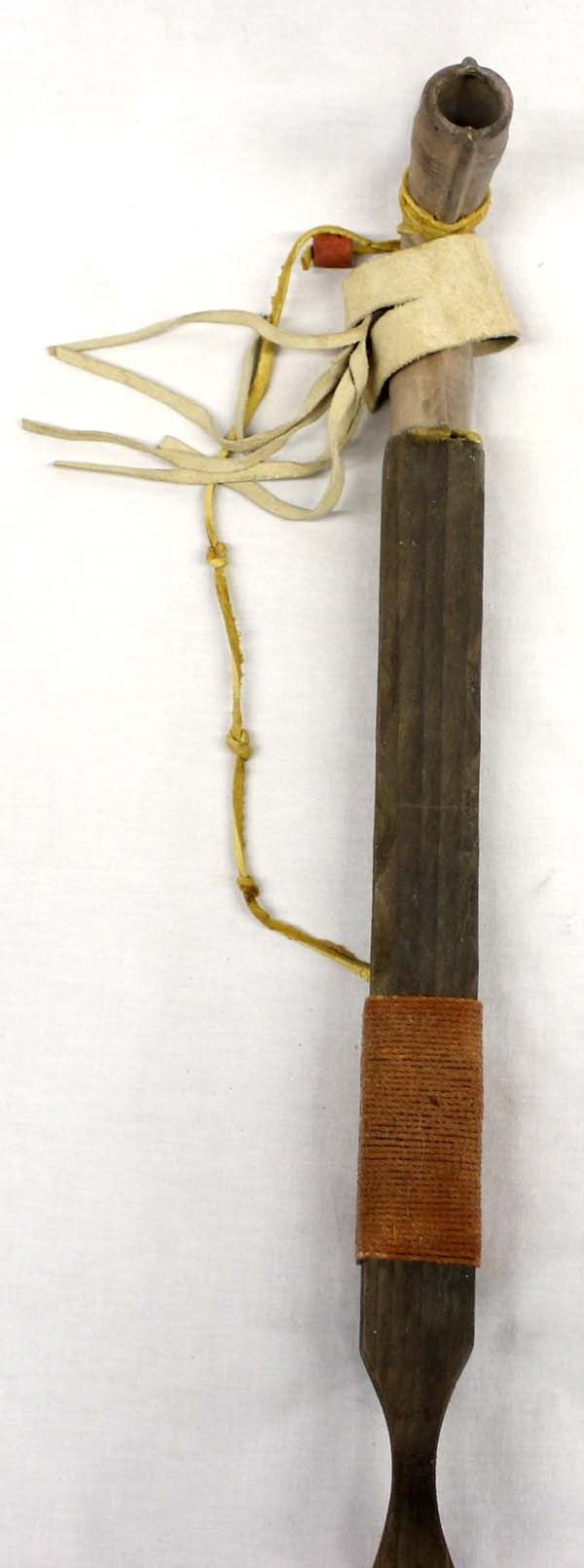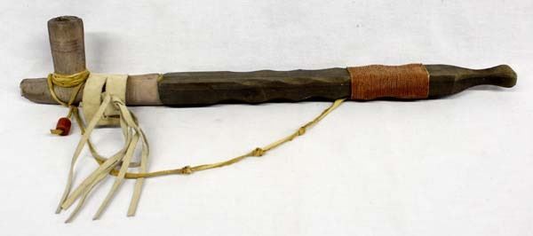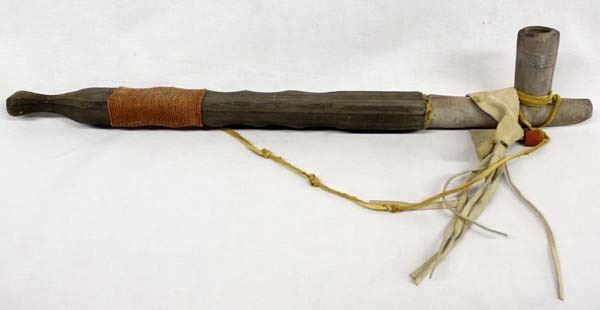 Vintage Native American Pottery T-Pipe, measures 19''L x 3.5'', embellished with leather and yarn, wood stem, small chip in end of pipe